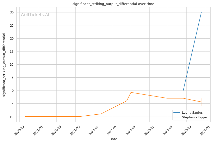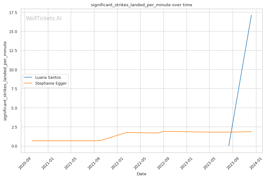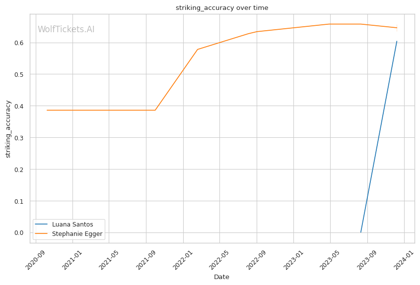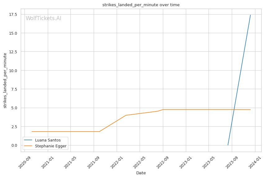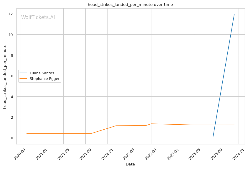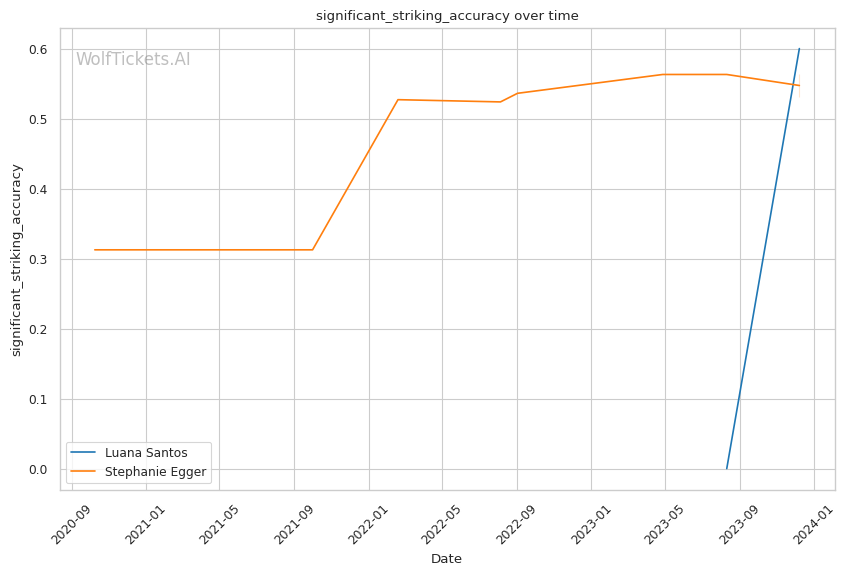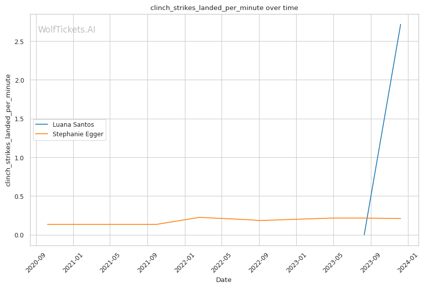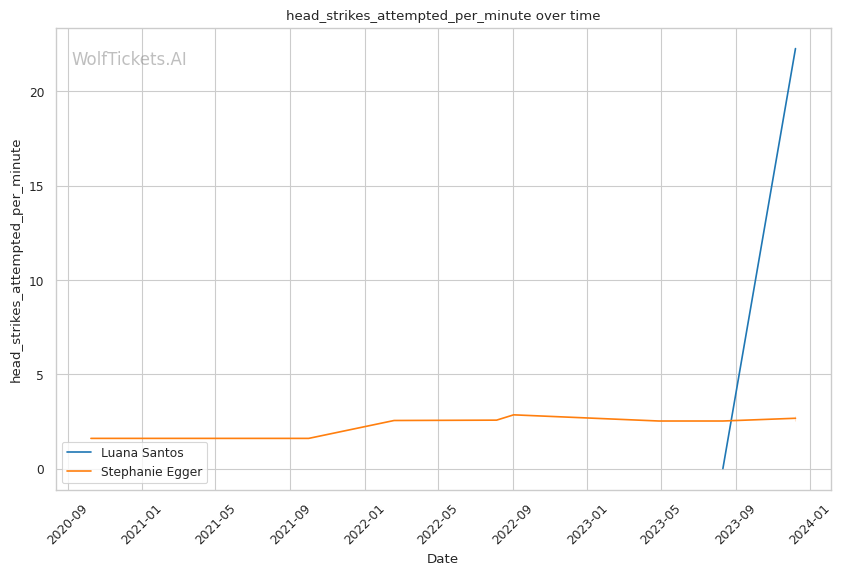 Luana Santos comes off a stellar performance against Juliana Miller, winning by TKO. Her striking is her standout attribute, as seen in her impressive stats: 17.3756 strikes landed per minute and a striking accuracy of 60.38%. Her recent head strikes landed per minute (11.9457) showcases her dominance in stand-up exchanges. This is critical in a matchup against a grappler like Egger, where controlling the distance and pace with striking could be a decisive factor.
