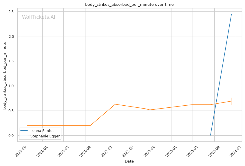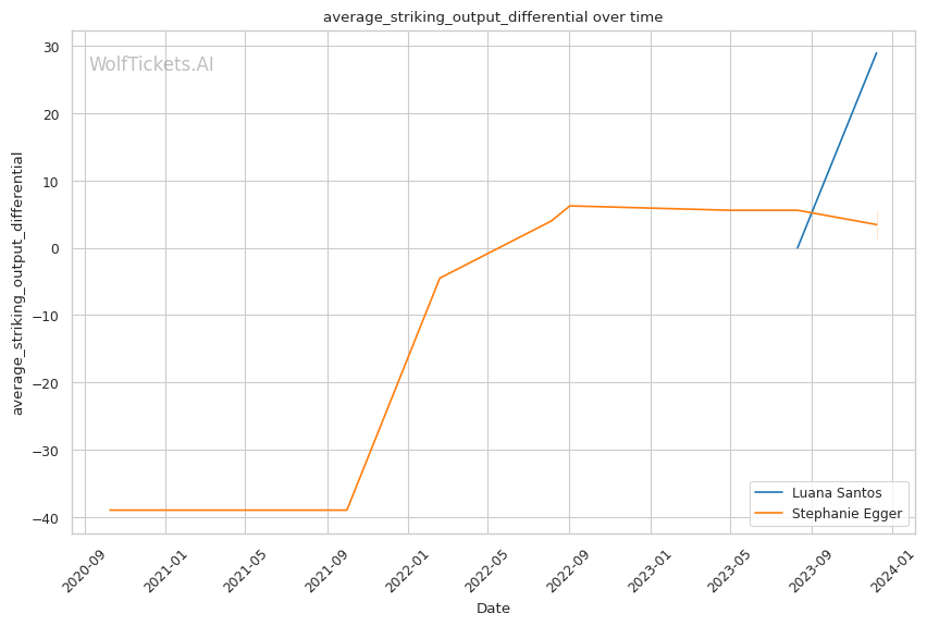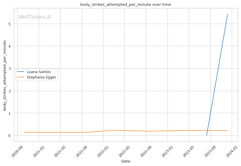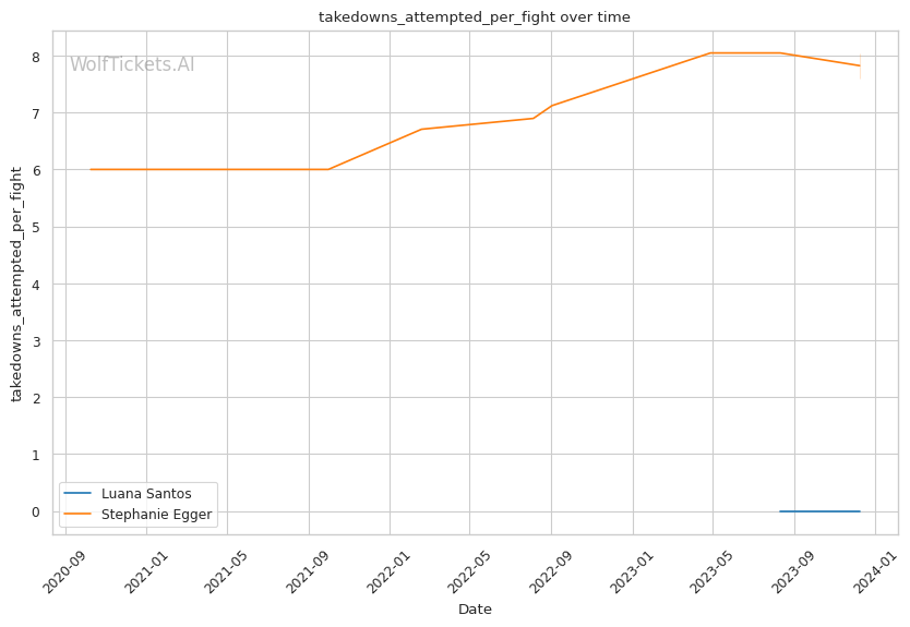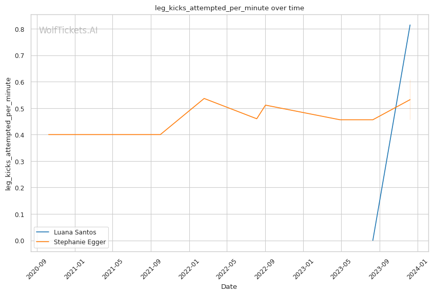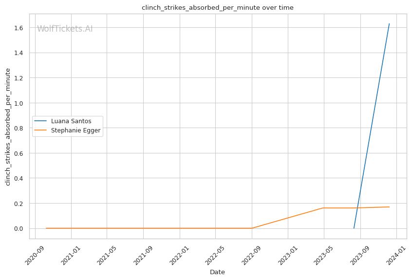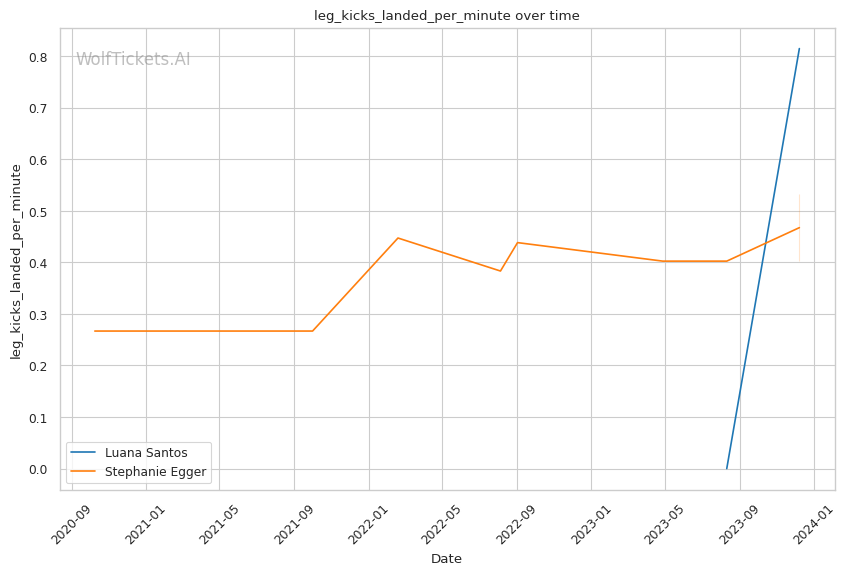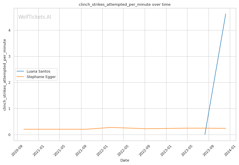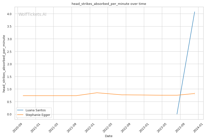 Luana Santos comes off a stellar performance against Juliana Miller, winning by TKO. Her striking is her standout attribute, as seen in her impressive stats: 17.3756 strikes landed per minute and a striking accuracy of 60.38%. Her recent head strikes landed per minute (11.9457) showcases her dominance in stand-up exchanges. This is critical in a matchup against a grappler like Egger, where controlling the distance and pace with striking could be a decisive factor.