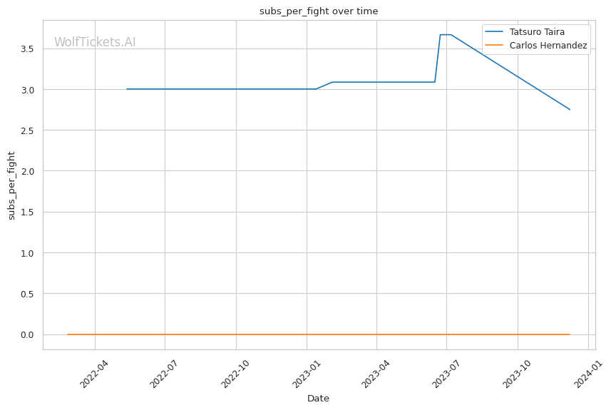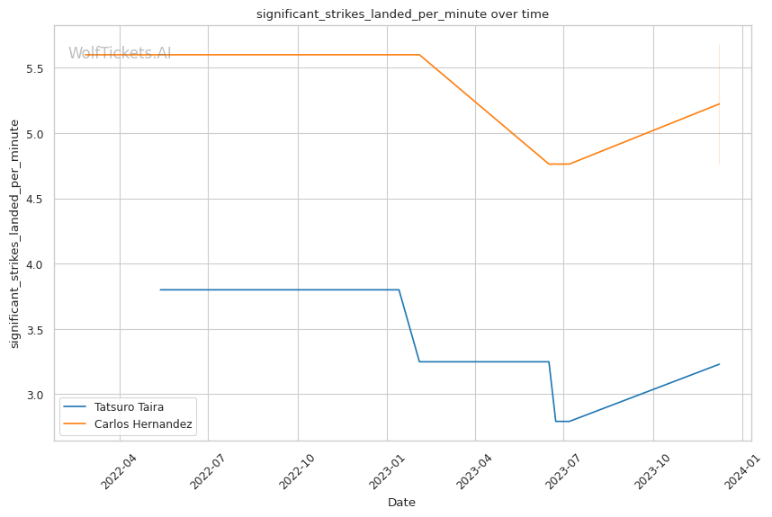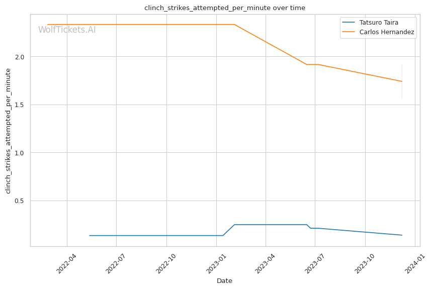 Strengths: - Undefeated Record: Taira boasts an impressive 14-0 record, a clear indicator of his dominance in the octagon. - Submission Specialist: With a high submission per fight ratio (2.7491), Taira has proven his prowess in grappling and ground game. - Effective Takedown Game: His recent takedown attempts (7.7700 per fight) and accuracy (0.3948) show his ability to control the pace and location of the fight. - Solid Striking: Notably strong in head strikes, both in terms of attempts (3.5968 per minute) and lands (2.2910 per minute).