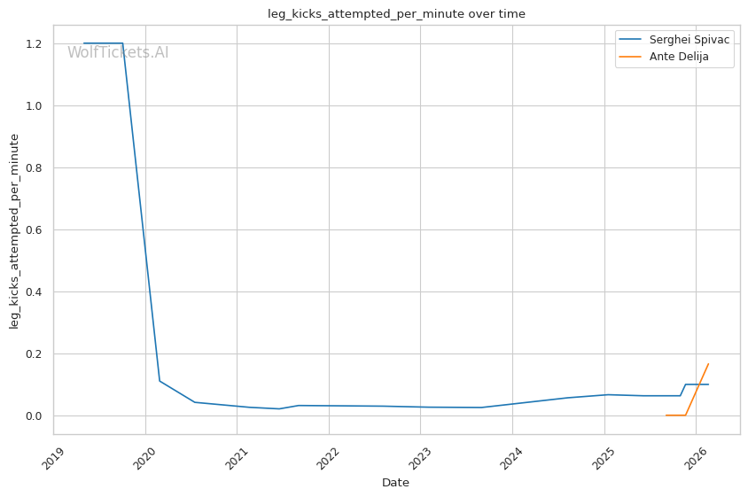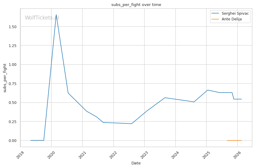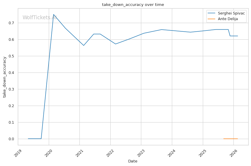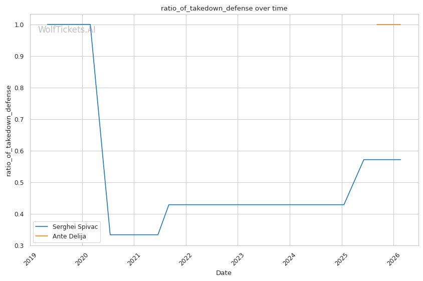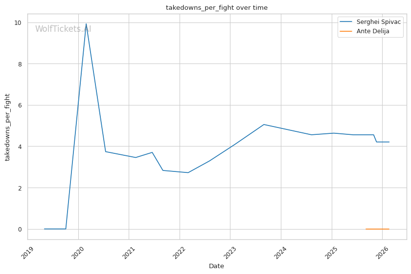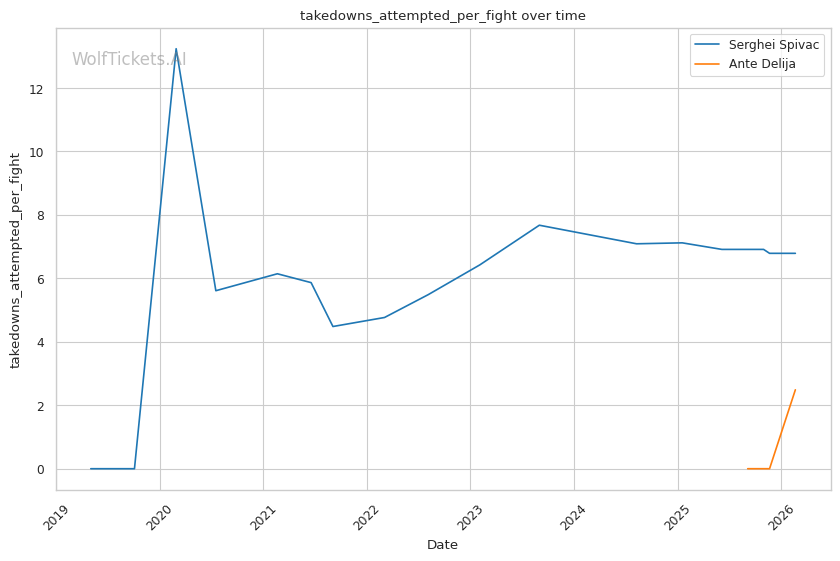 Recent Takedowns Attempted per Fight (+5.0): This is the largest factor. Spivac's 6.28 recent takedown attempts per fight versus Delija's 0.76 represents a massive grappling activity differential. The model heavily weights this disparity.