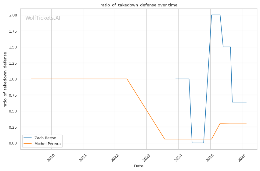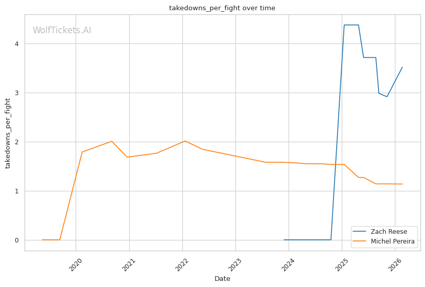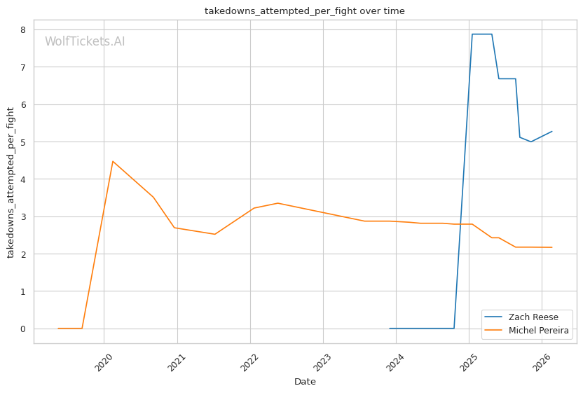 Reese's wrestling could be the key. Pereira's takedown defense ratio sits at just 30.77%, and his recent takedown defense is even worse at 28.24%. Against Hernandez, Pereira was thoroughly dominated on the ground. Reese attempts 5.6 takedowns per fight recently and has shown he can finish fights once he gets top position.