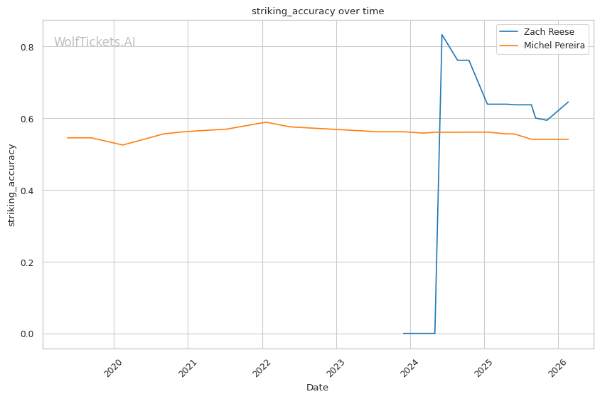 Pereira's recent win percentage is 0% over his last stretch, while Reese sits at 67%. The momentum clearly favors Reese.