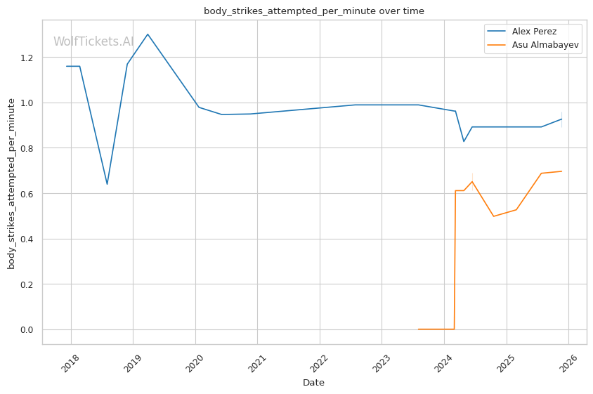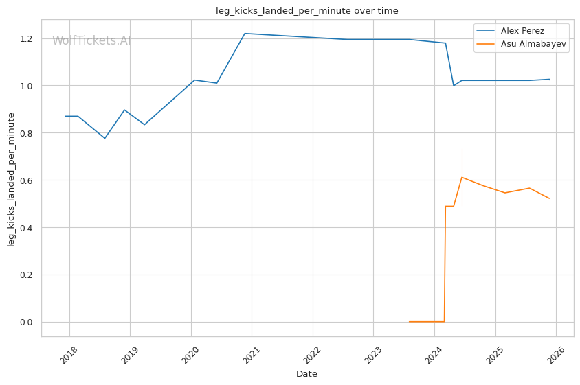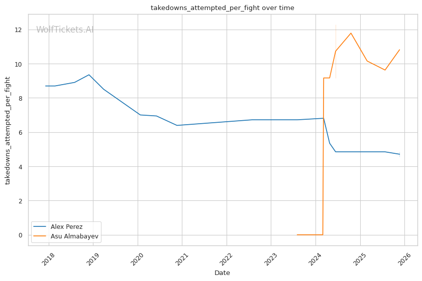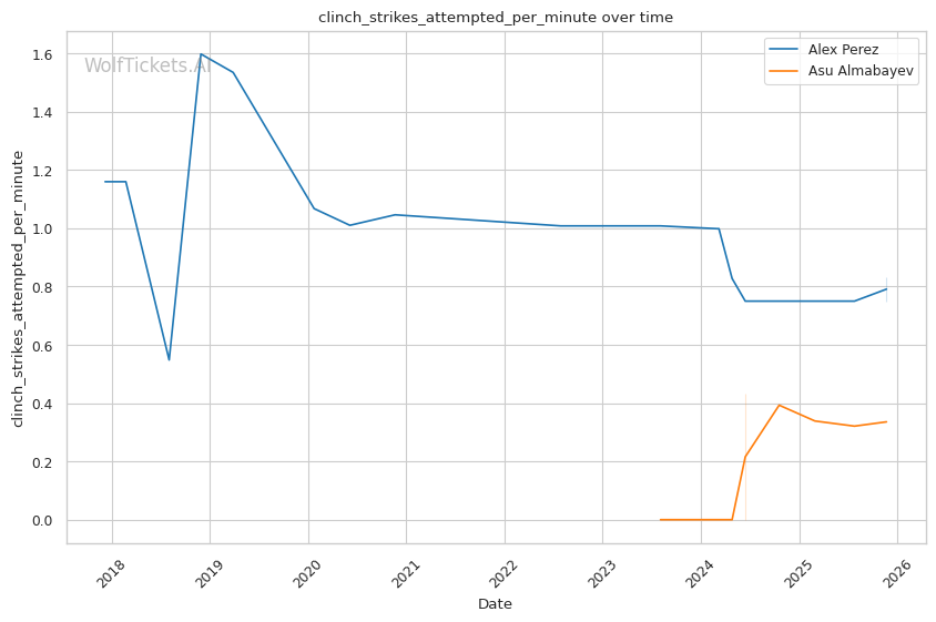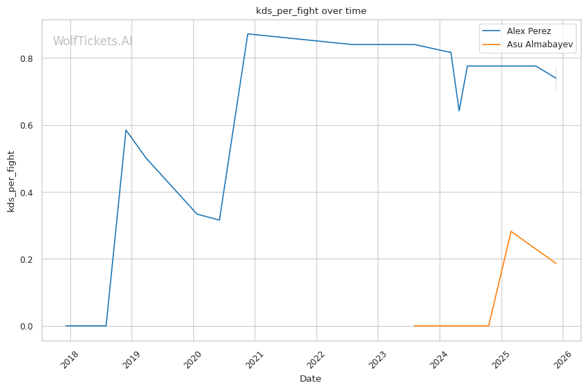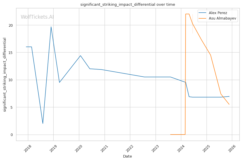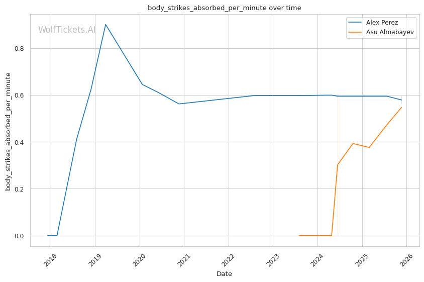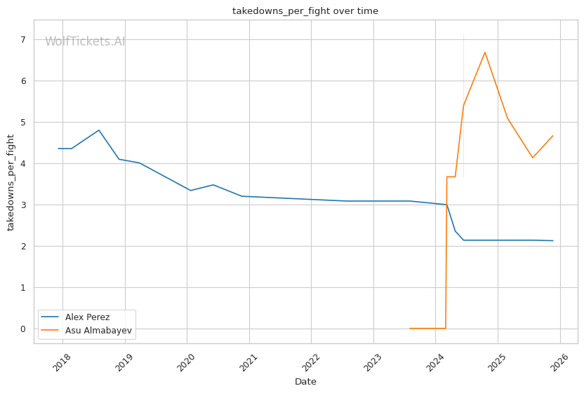 This is a three-round fight, but if it goes the distance, Perez's cardio concerns become relevant. His run-and-swing pressure against Taira was inefficient and left him exposed. Almabayev's grappling-heavy approach is cardio-intensive, but his recent performances (five straight decisions) suggest he can maintain pace. Perez's striking output declined in Round 3 against Mokaev, allowing Mokaev to find success on the feet despite being exhausted. If Almabayev can maintain top control into the third round, Perez's defensive reserves will be depleted.