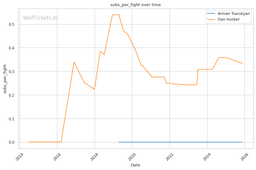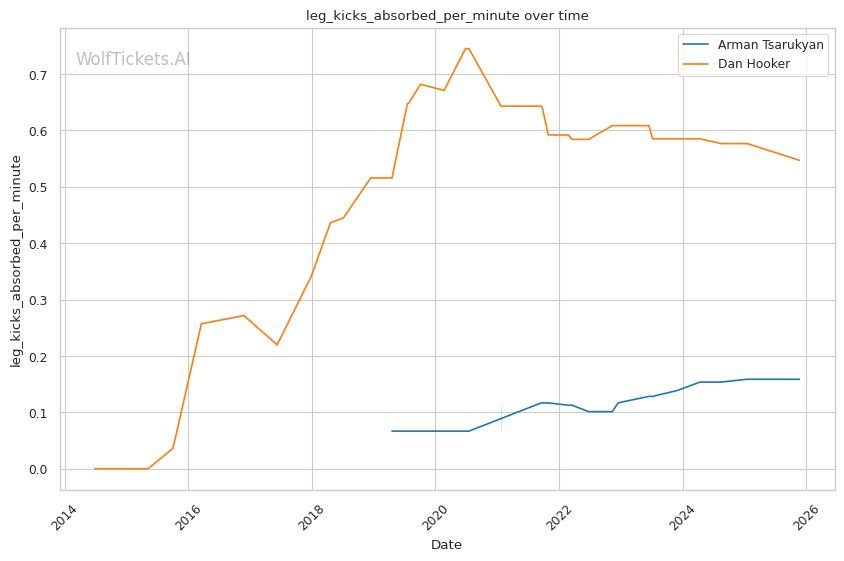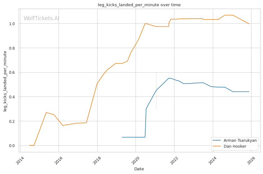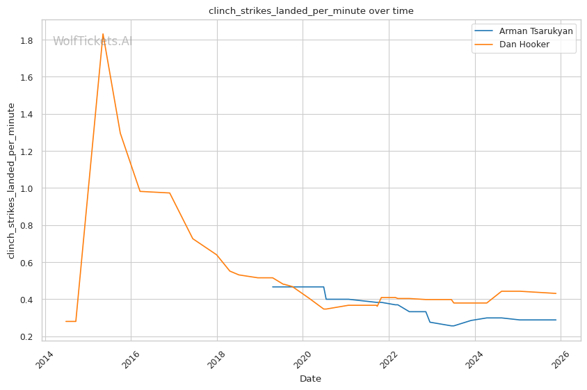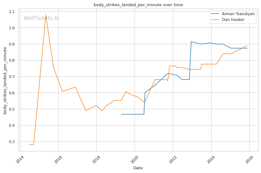 Cardio deterioration in later rounds: Against Arnold Allen at featherweight, Hooker's defensive responsibility declined significantly in the championship rounds. Allen's speed overwhelmed him late. Against Michael Chandler, the body shot that dropped his hands came after sustained pressure. Hooker's recent striking output differential is strong (20.09), but that's built on fights where he banked early rounds. Can he maintain output when Tsarukyan's pace never relents?