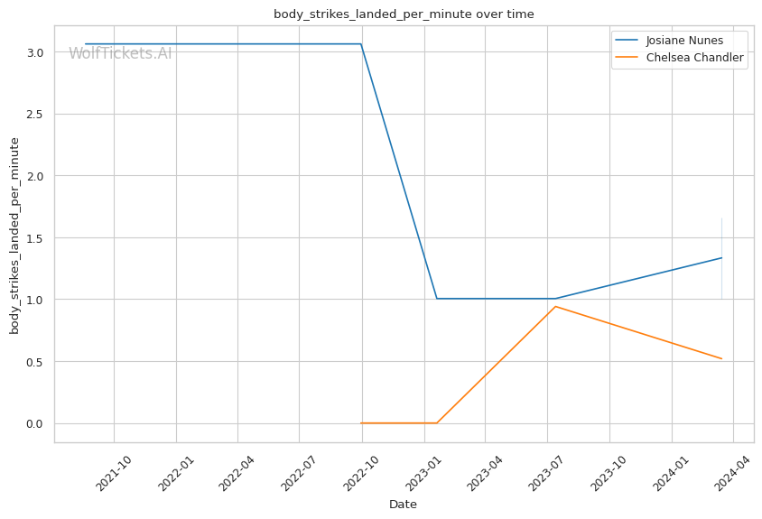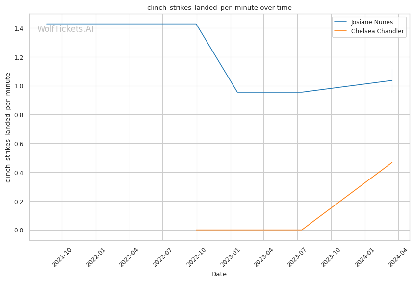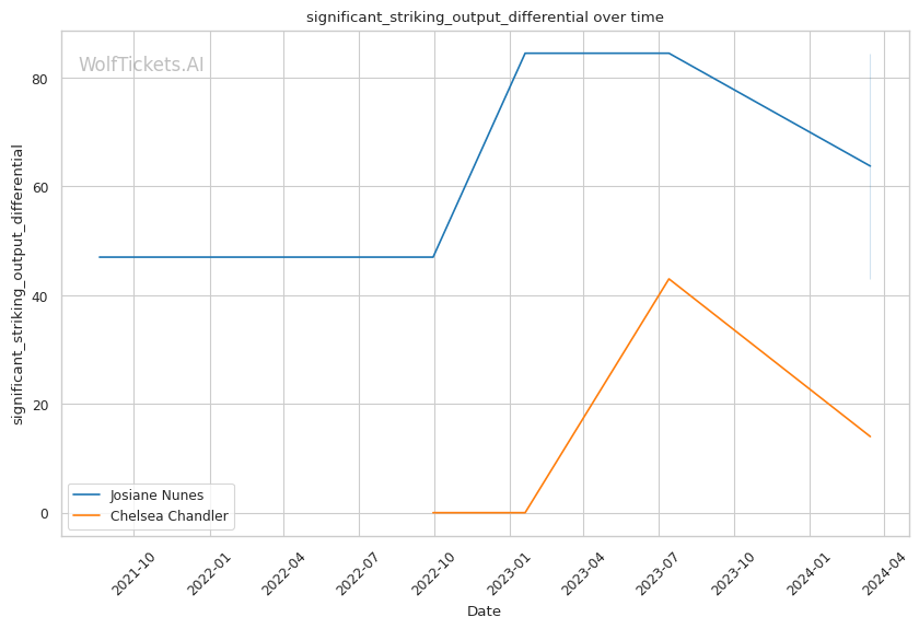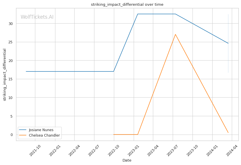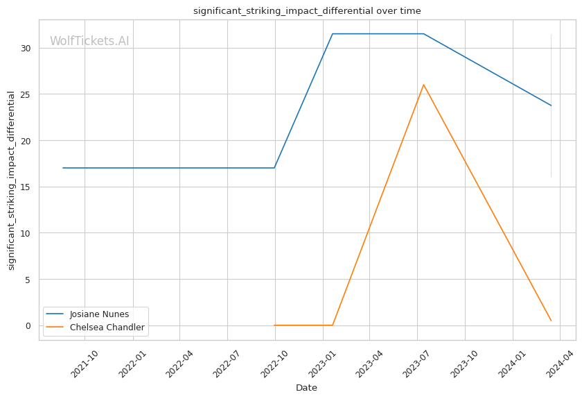If the fight stays standing, Nunes's power and pressure could be too much for Chandler. Nunes lands 7.22 significant strikes per minute compared to Chandler's 3.12, and Nunes's striking impact differential is much higher at 16.0 vs 0.5 for Chandler.