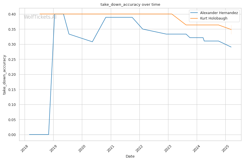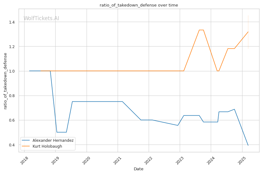 Holobaugh's ground game will be his clearest path to victory against Hernandez, but his approach isn't one-dimensional. Against Kaynan Kruschewsky in July, he relied on his jab to control distance and pace en route to a unanimous decision win. This striking control was disrupted in his previous bout against Trey Ogden, where he struggled with Ogden's pressure and couldn't establish his rhythm.