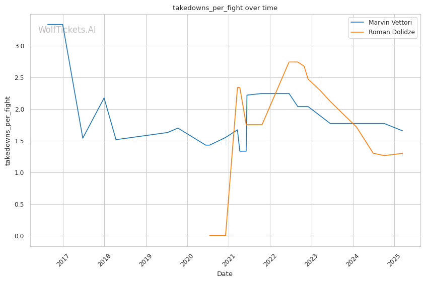 Expect Vettori to implement the same gameplan that earned him a clear decision in their first meeting. His relentless pressure, superior cardio, and proven ability to neutralize Dolidze's creative offense should carry him to victory once again. While Dolidze always presents a finishing threat with his powerful strikes and crafty submissions, Vettori's legendary durability and consistent approach make him the rightful favorite. WolfTicketsAI sees Vettori grinding out another decision victory through superior fundamentals and pressure fighting.