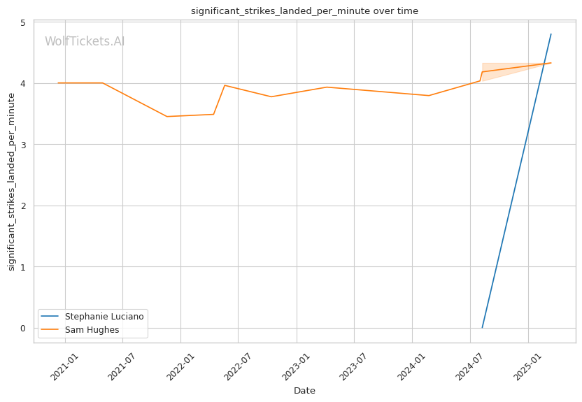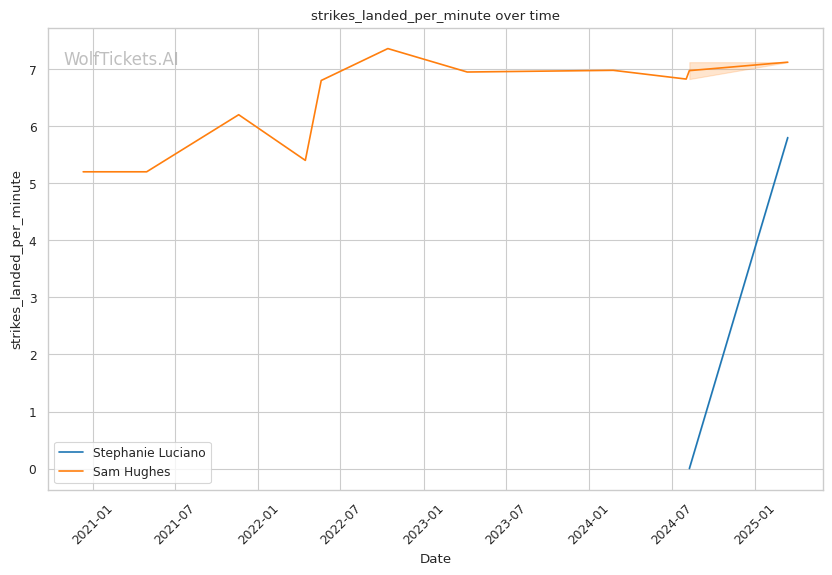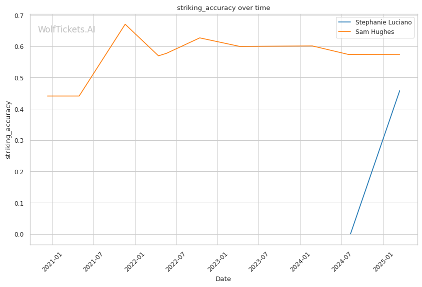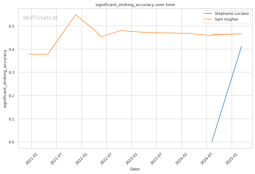 Luciano's technical Muay Thai striking, superior defensive metrics, and knockout power create a stylistic nightmare for Hughes. While Hughes has shown admirable evolution in defensive grappling, her struggles against precise strikers remain evident. Expect Luciano to control distance with her 1-inch reach advantage, maintain a higher striking accuracy, and consistently outstrike Hughes en route to victory. WolfTicketsAI confidently predicts Stephanie Luciano to continue her winning streak in the women's strawweight division.