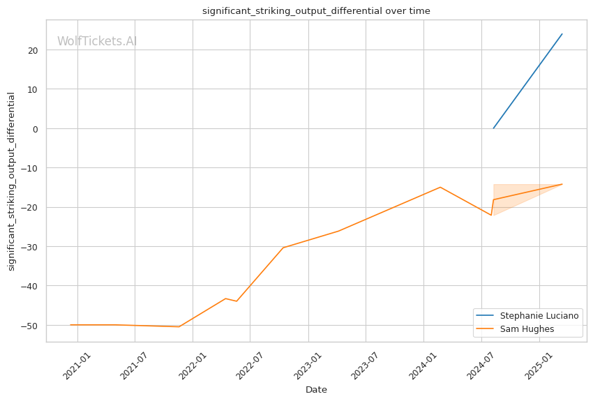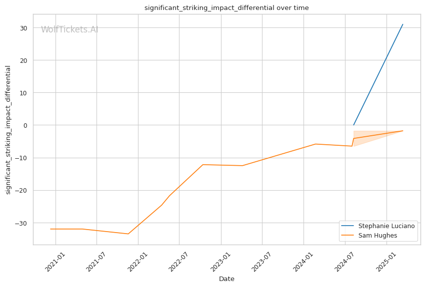 Striking Differential: Luciano's significant striking impact differential (+31.0) dwarfs Hughes' numbers (-1.7778), suggesting a major advantage in landing meaningful shots.