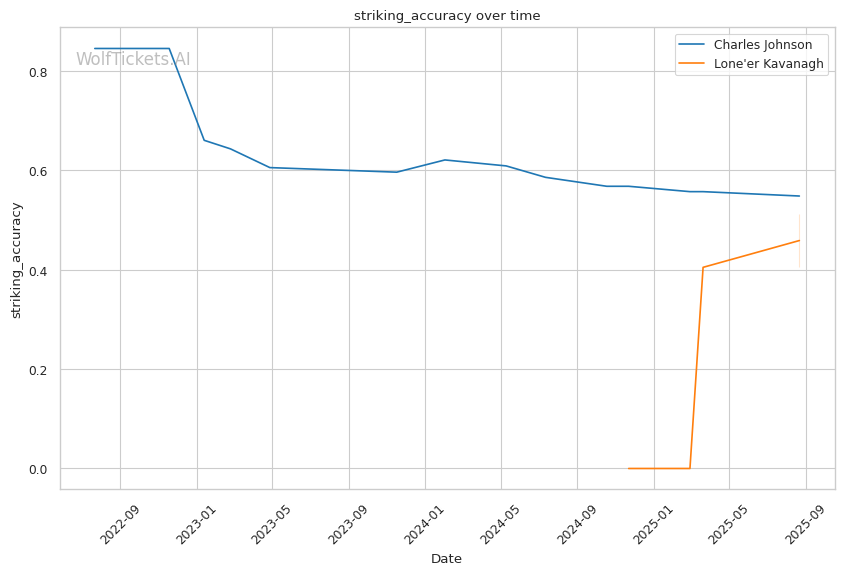 WolfTicketsAI has struggled with Johnson predictions recently, going 1-1 in his last two fights after incorrectly predicting him to beat Temirov. The model showed better accuracy earlier in Johnson's career but has missed on several of his recent performances. For Kavanagh, the model correctly predicted his decision win over dos Santos, showing confidence in the undefeated prospect's abilities.