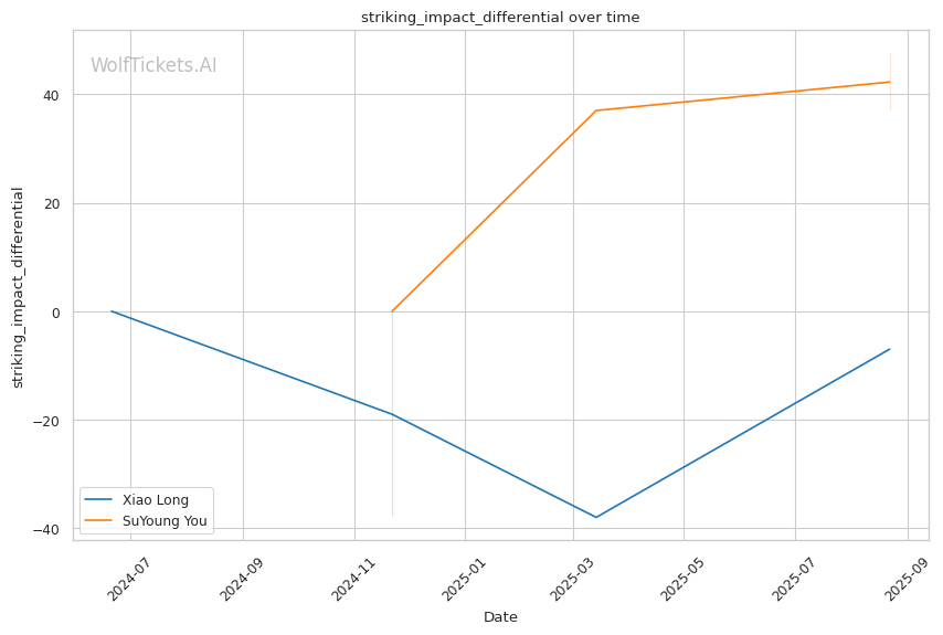 Recent Win Percentage decreased the score by 3 points, acknowledging Long's recent struggles (33% recent win rate versus You's 67%). The Recent Significant Striking Impact Differential decreased by 2 points, highlighting Long's negative damage differential versus You's positive metrics.