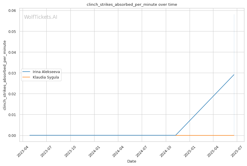 Alekseeva's body lock takedowns directly exploit Sygula's tendency to turn away when pressured against the fence. While Sygula attempts headlock throws, Alekseeva's superior clinch positioning and takedown accuracy (20% vs 0%) suggests she'll control these exchanges.