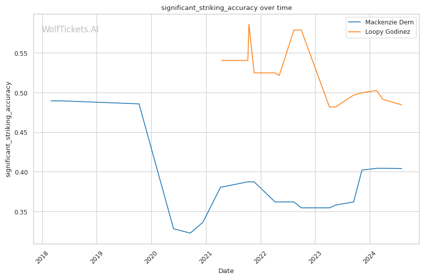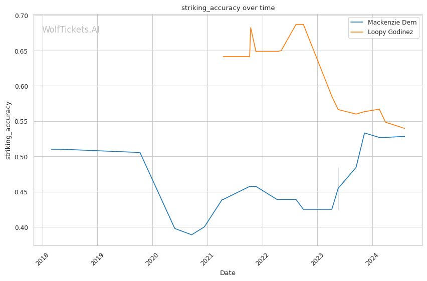 Godinez's recent performances have shown a marked improvement in her striking, which she uses effectively to set up her takedowns. Her takedown accuracy of 51.84% is significantly higher than Dern's, suggesting she may have an advantage in dictating where the fight takes place.