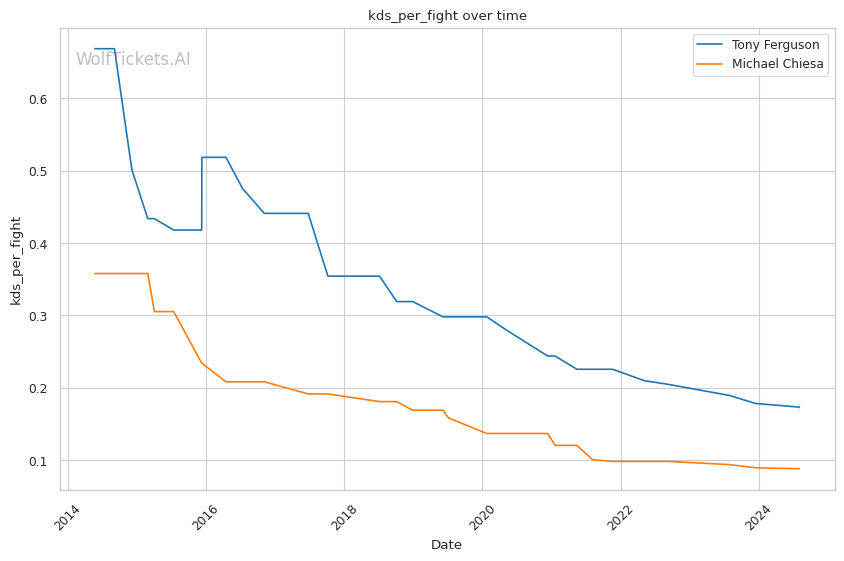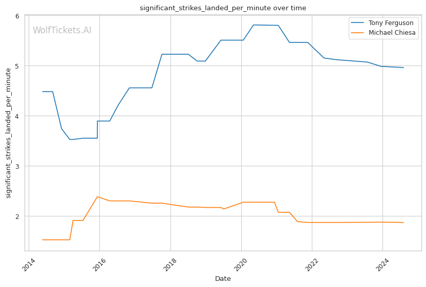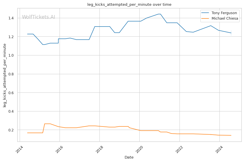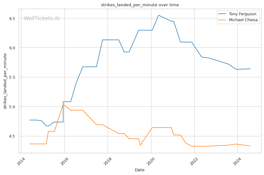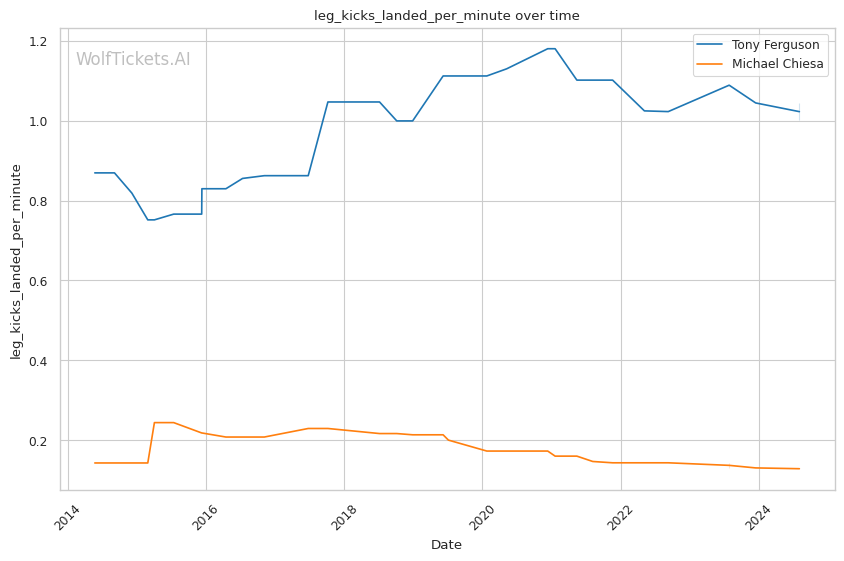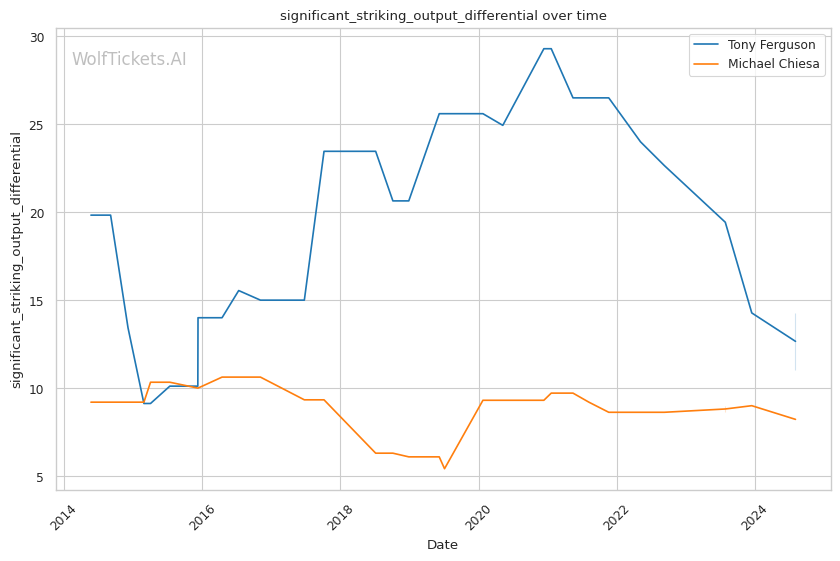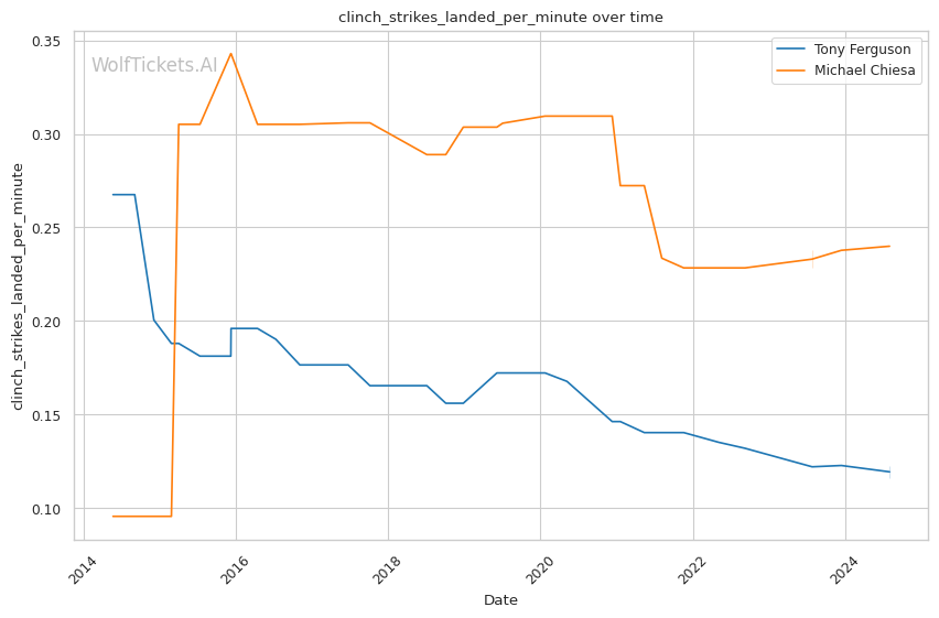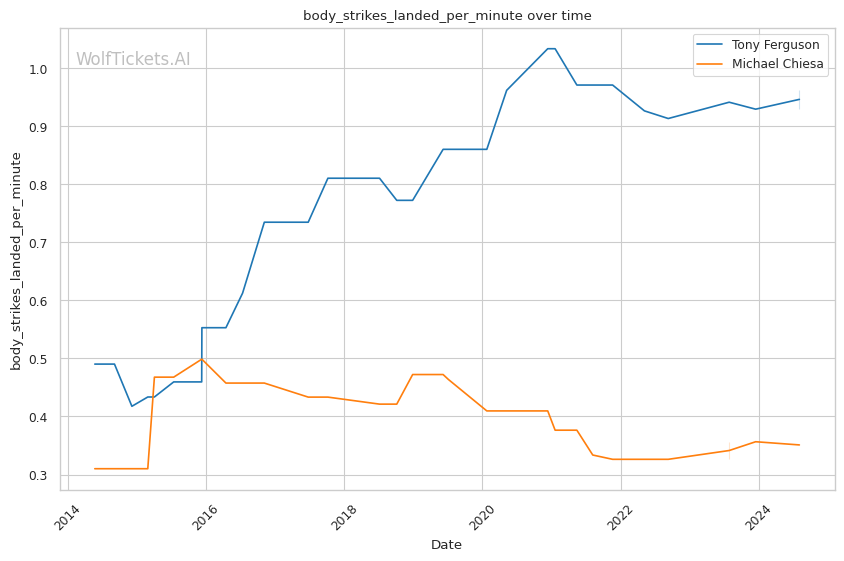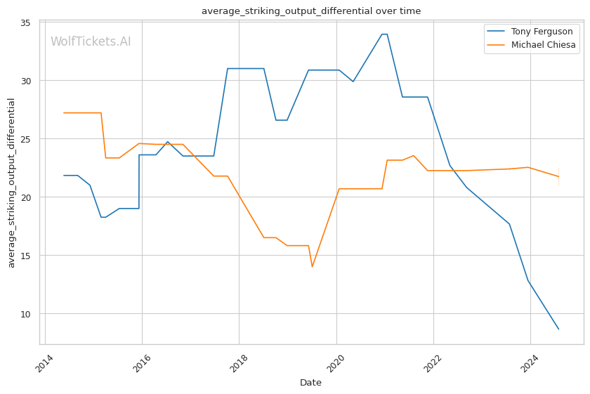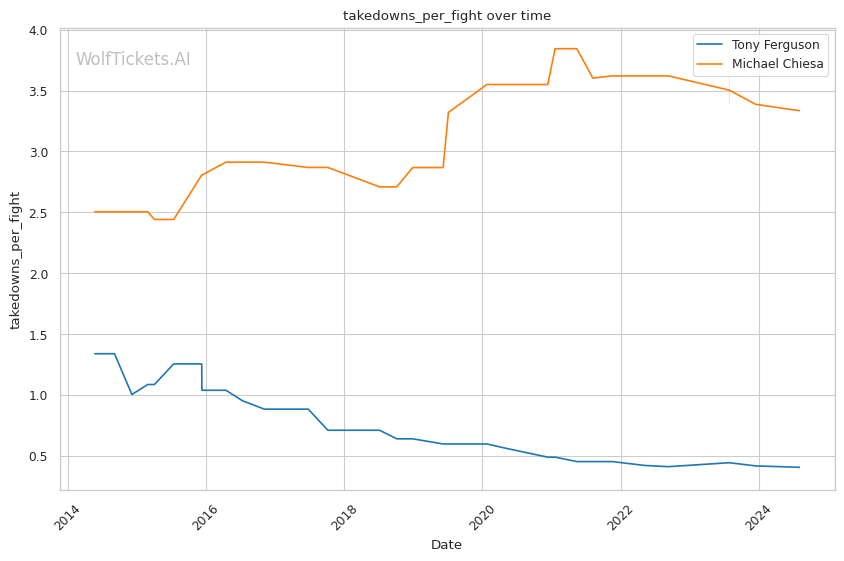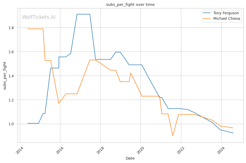Michael Chiesa, primarily known for his grappling prowess, has shown a more well-rounded game in recent years. Despite coming off two losses, Chiesa's move to welterweight has generally been more successful than Ferguson's. His submission skills remain a significant threat, with a submissions per fight rate of 0.9653.