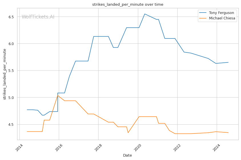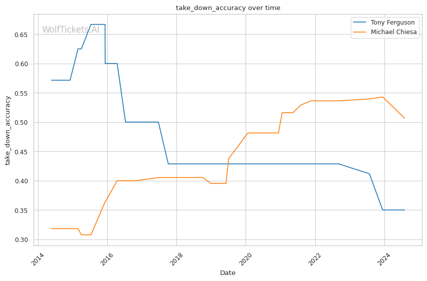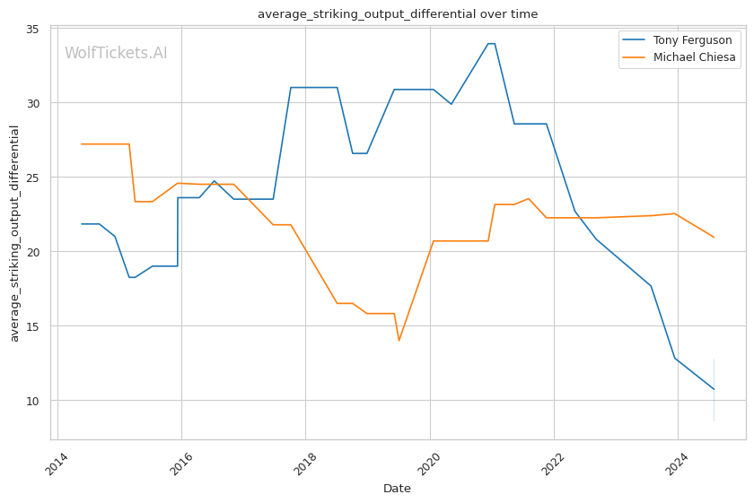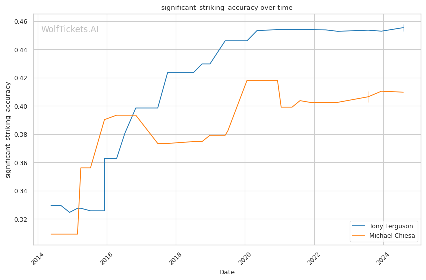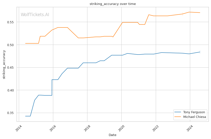 Chiesa's striking has improved, though it's not his primary weapon. His significant striking accuracy of 40.97% is lower than Ferguson's, but he compensates with a strong grappling game. Chiesa's takedown accuracy of 50.67% and 3.3346 takedowns per fight demonstrate his ability to control the fight on the ground.