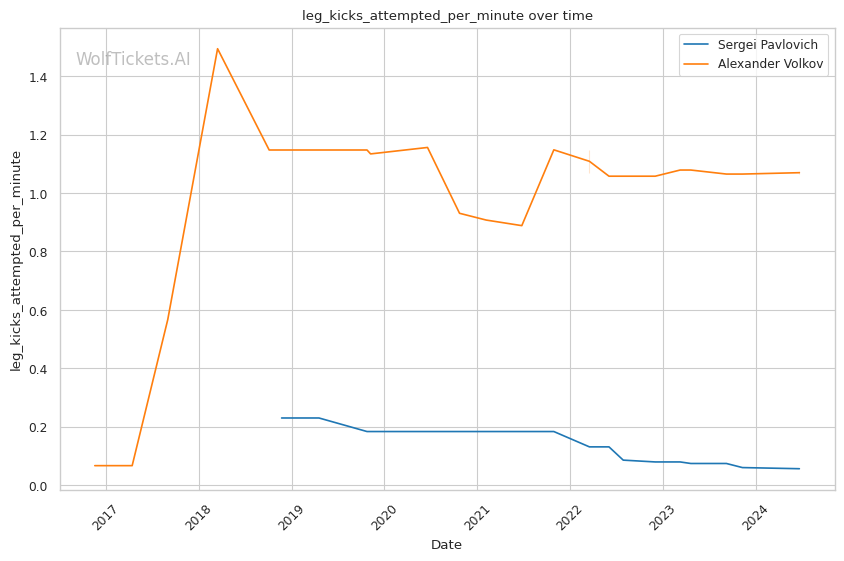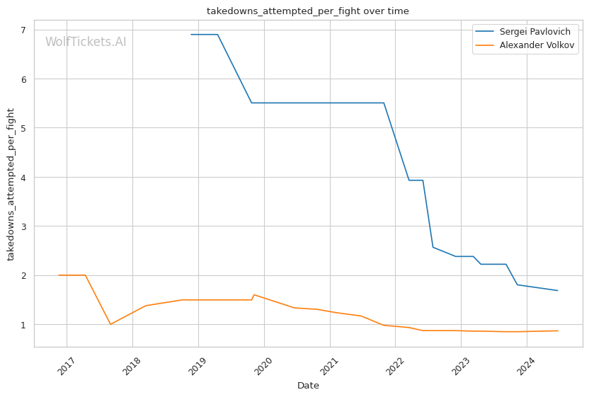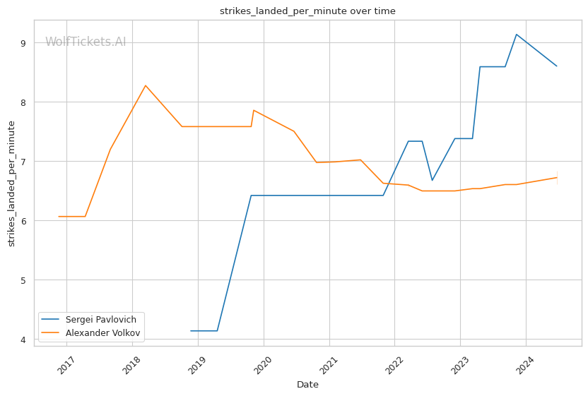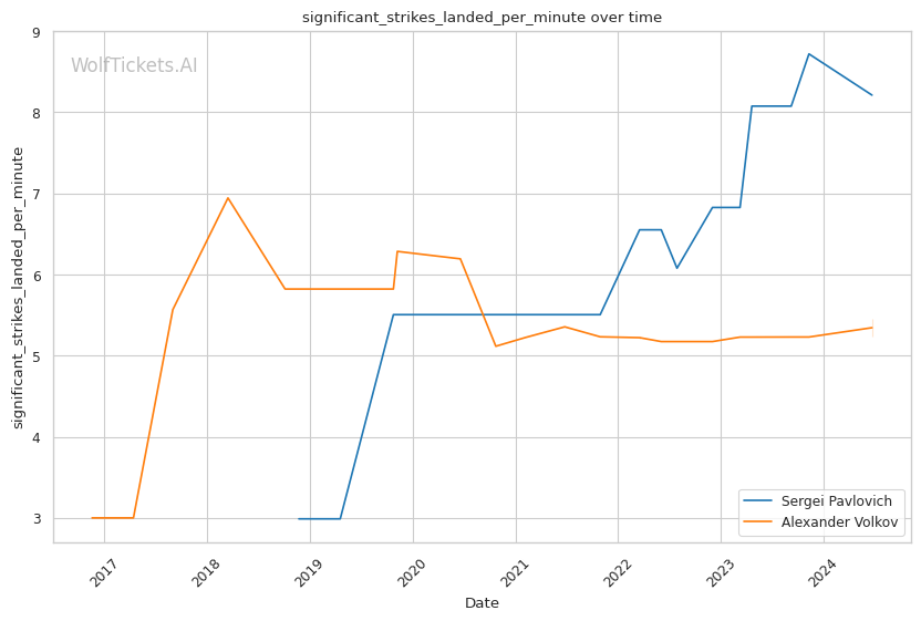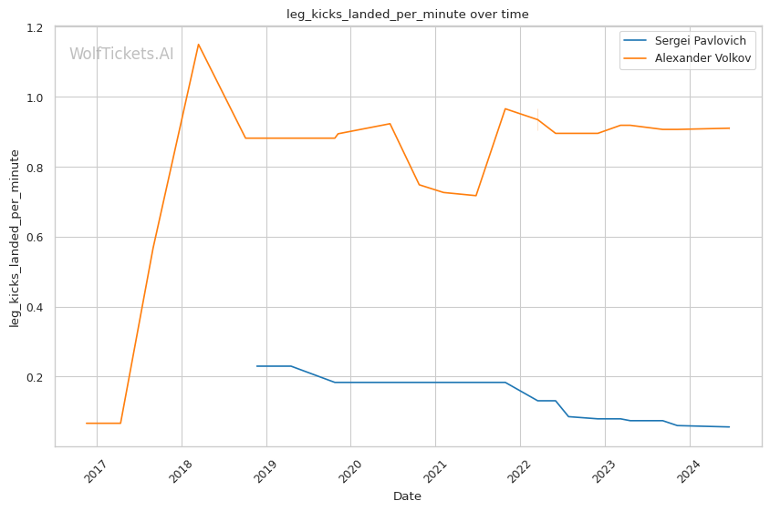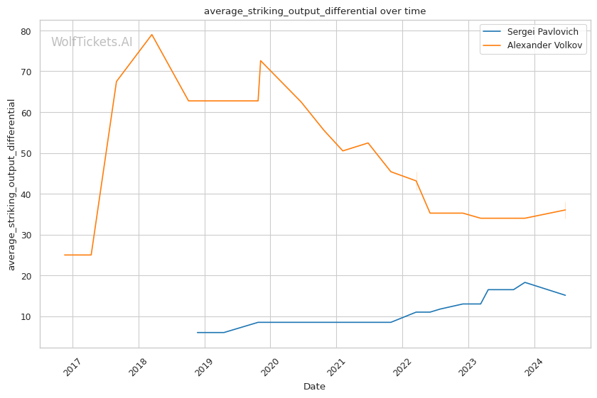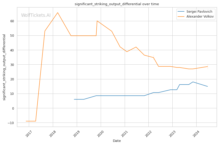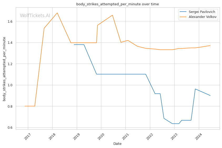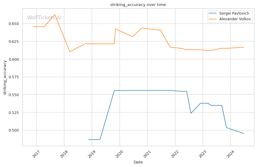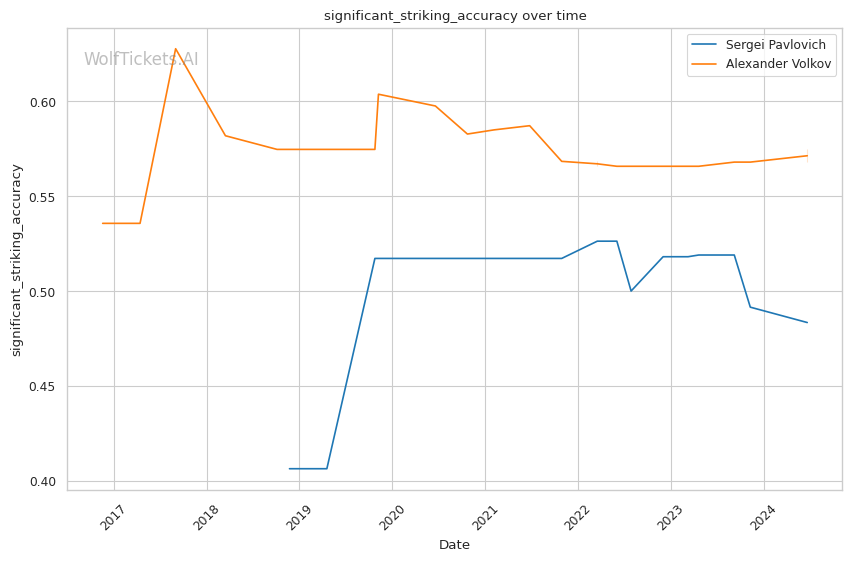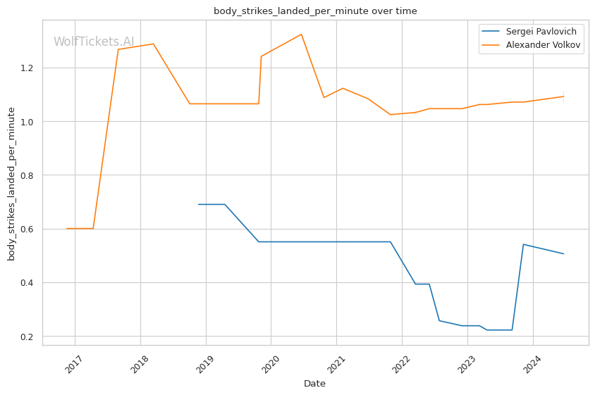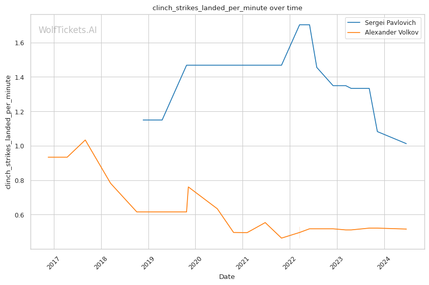 Volkov is a high-volume, technically sound striker, landing 5.84 significant strikes per minute at a very solid 62.7% accuracy rate recently. He doesn't possess one-punch KO power like Pavlovich, but steadily breaks opponents down with volume and variety, fighting behind his jab and mixing in kicks. Volkov's game plan revolves around maintaining distance, using his footwork and boxing to pick apart opponents from the outside.