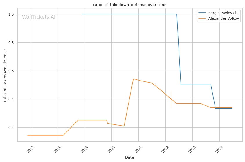 While primarily a striker, Volkov is competent in all areas. He lands 0.65 takedowns per fight at a strong 74.7% accuracy rate and has submitted dangerous strikers like Fabricio Werdum and Tai Tuivasa in the UFC. His takedown defense is solid at 61.7%.
