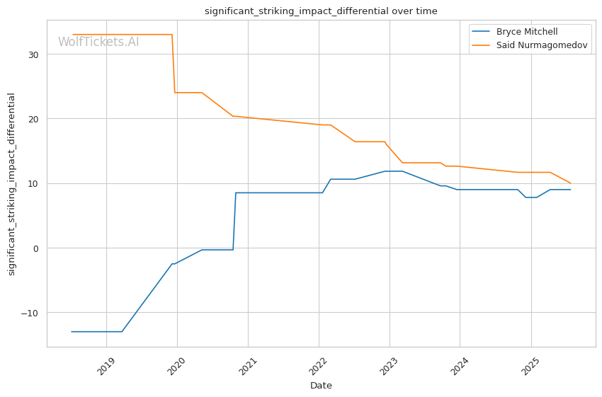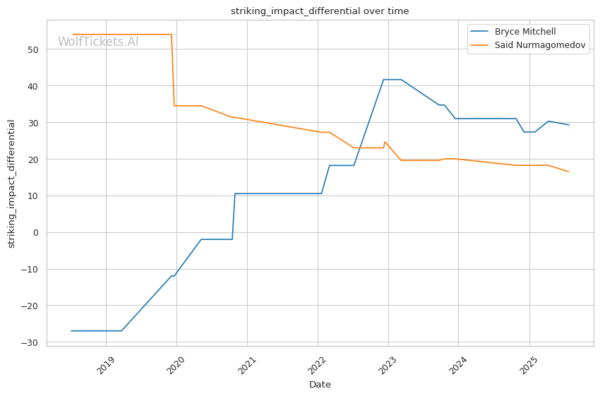 The model's confidence stems from several key statistical advantages for Mitchell: - Odds increased the prediction score by 4.0, reflecting Mitchell's betting favorite status despite recent struggles - Recent Win Percentage boosted confidence by 3.0, though both fighters have struggled recently - Significant Striking Impact Differential and Recent Takedowns Attempted per Fight each added 1.0, highlighting Mitchell's grappling pressure advantage - Striking Impact Differential contributed 1.0, suggesting Mitchell's grinding style creates cumulative damage over time