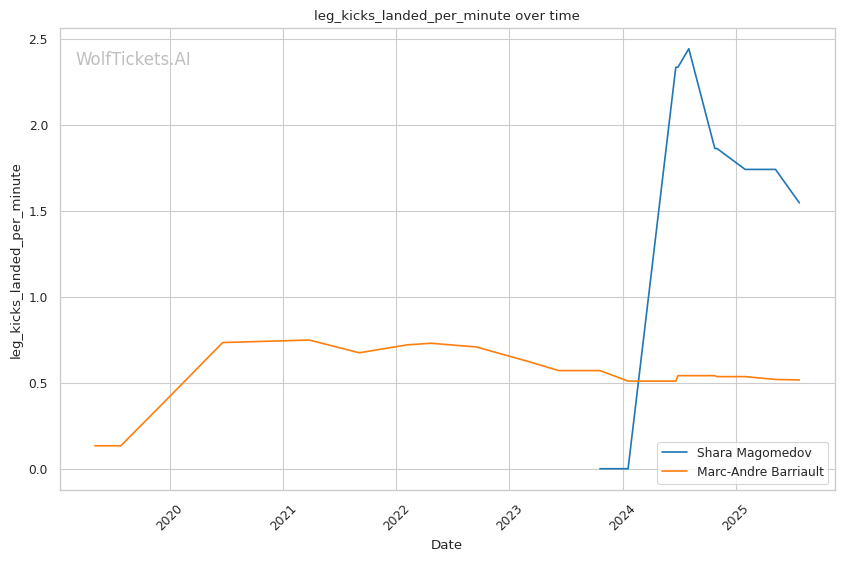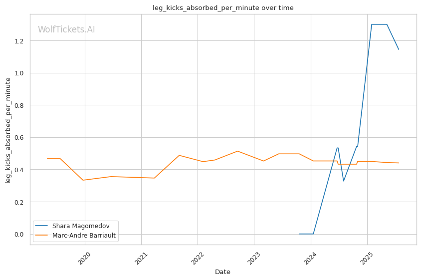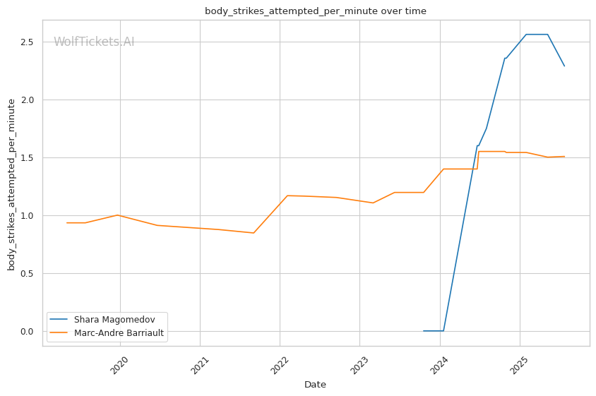 • Kicking vs Boxing: Magomedov's volume kicking approach exploits Barriault's poor kick defense • Defensive Decline: Barriault's recent knockout losses show deteriorating defensive awareness • Clinch Finishing: Magomedov's double collar tie and knees could exploit Barriault's tendency to back straight up when hurt • Range Control: Magomedov's distance management should neutralize Barriault's pressure boxing