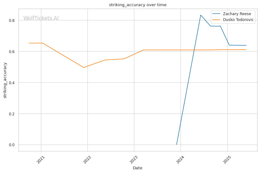 Zachary Reese has the technical tools to exploit Dusko Todorovic's defensive vulnerabilities. Todorovic's tendency to rush forward without proper defense and his vulnerability during clinch breaks play directly into Reese's counter-striking strengths. While both fighters have shown defensive issues, Todorovic's concerning pattern of knockout losses makes him the more vulnerable fighter in this matchup. Reese's systematic body attacks and precise counter-striking should allow him to control the fight and potentially find a finish. WolfTicketsAI predicts Zachary Reese will emerge victorious in this middleweight clash.
