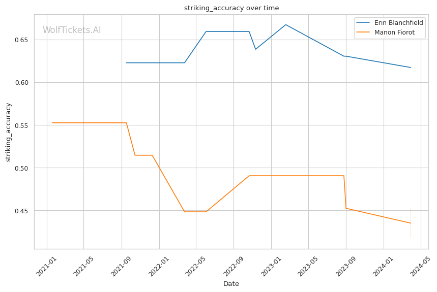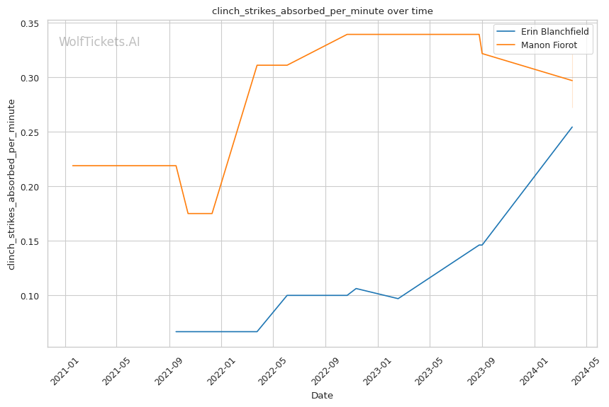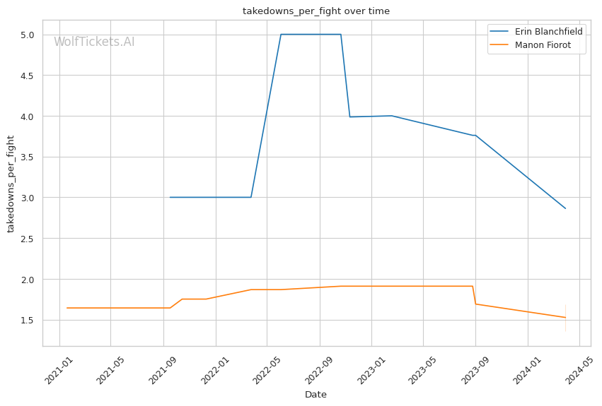 Blanchfield's wrestling metrics are impressive with 2.86 takedowns landed per fight recently at a 62% accuracy rate. In contrast, Fiorot's 18% takedown defense in her recent fights suggest vulnerability.
