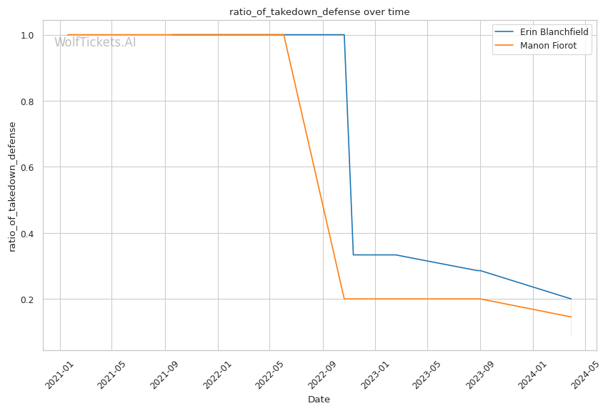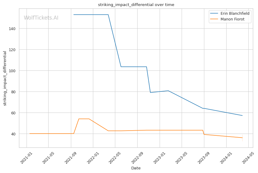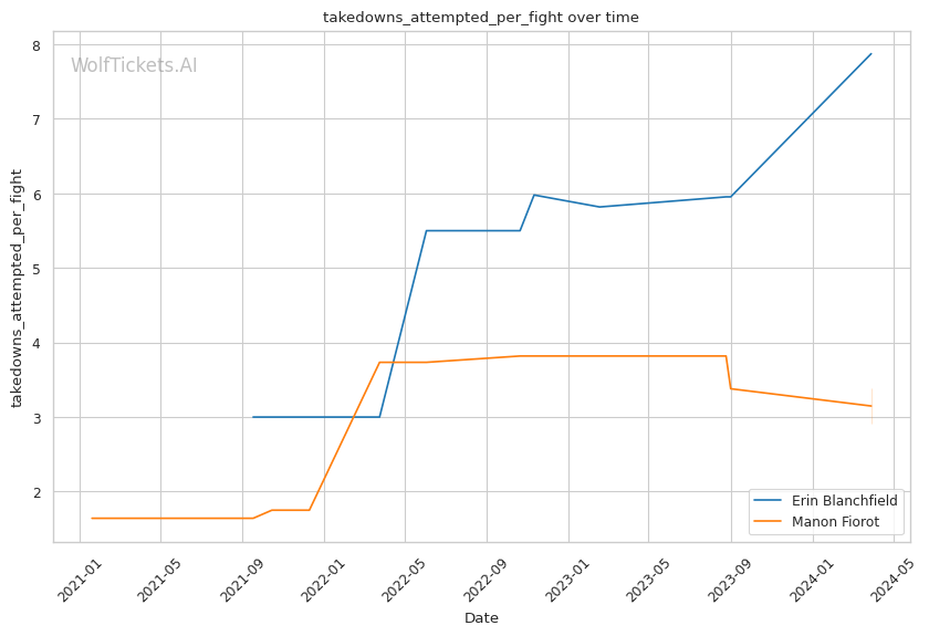 Blanchfield's superior grappling and ability to finish fights on the mat. With a submission rate of 1.19 per fight, much higher than Fiorot's 0, Blanchfield is a constant threat.