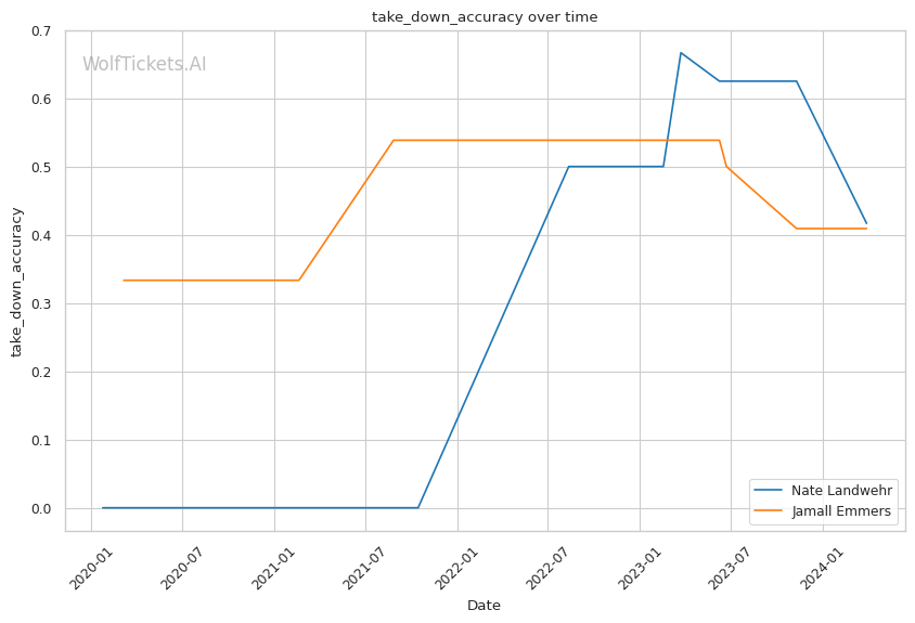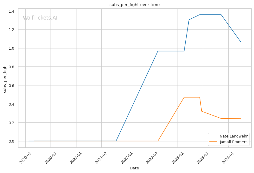 In particular, Emmers' 22.39 significant striking output differential dwarfs Landwehr's 4.64, painting the picture of the more active and accurate striker. He also attempts far more takedowns (5.76 per fight vs Landwehr's 2.45).