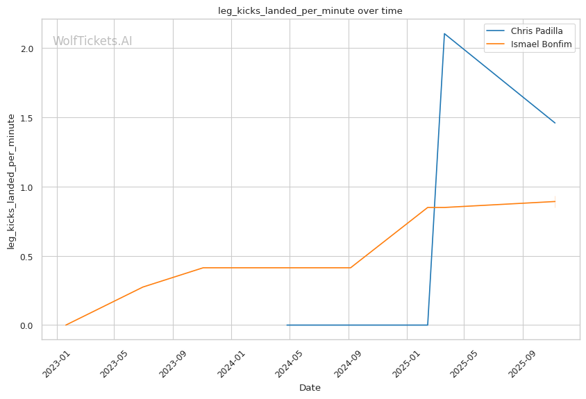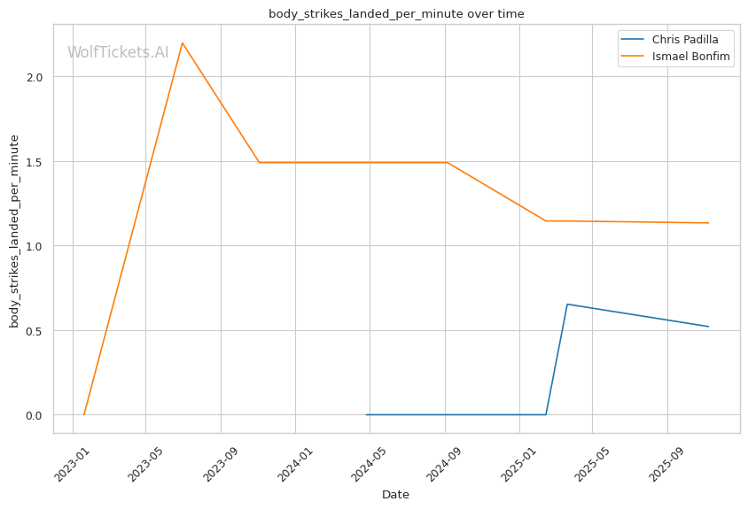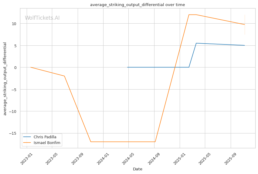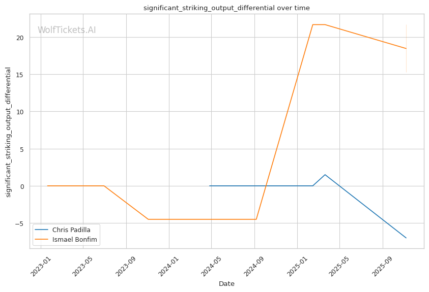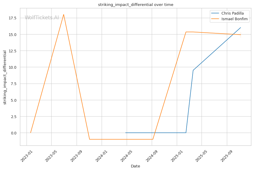 The problem for Padilla: he needs to land body shots first, and Bonfim's footwork and jab will make closing distance extremely difficult. Padilla's recent average striking output differential of 3.85 compared to Bonfim's 0.77 suggests Padilla is landing more than he's absorbing in recent fights, but that's against lower-level competition. Bonfim's significant striking impact differential of 16.92 in recent fights dwarfs Padilla's 3.79, indicating Bonfim lands harder, more damaging shots.