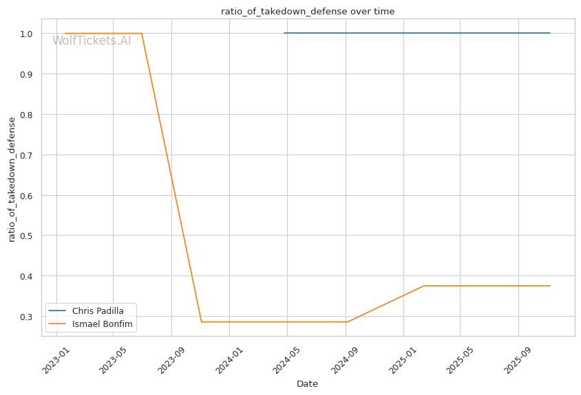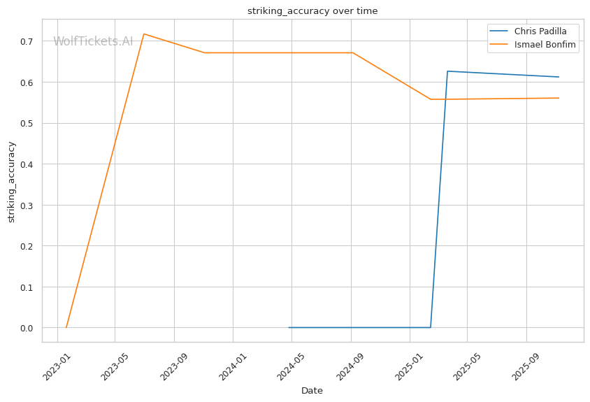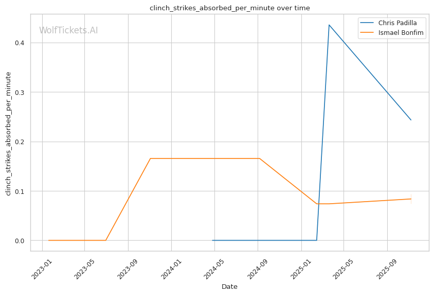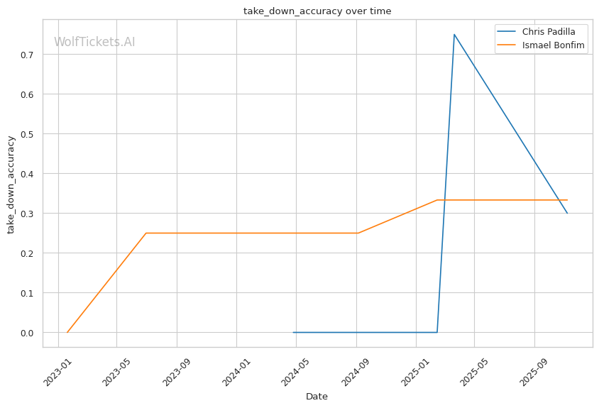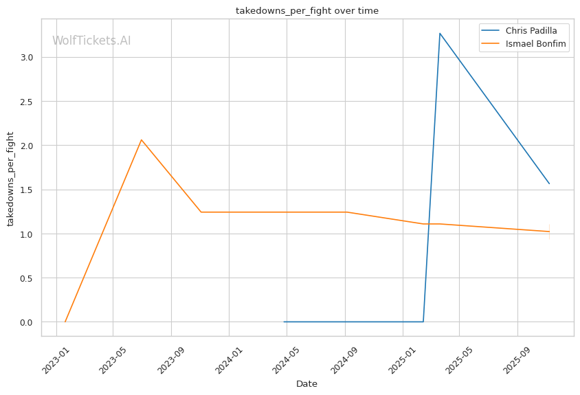 Takedown Accuracy Mismatch: Padilla's 30% recent takedown accuracy against Bonfim's 37.5% takedown defense suggests Padilla will struggle to complete takedowns. Without his clinch game, Padilla becomes a plodding pressure fighter.