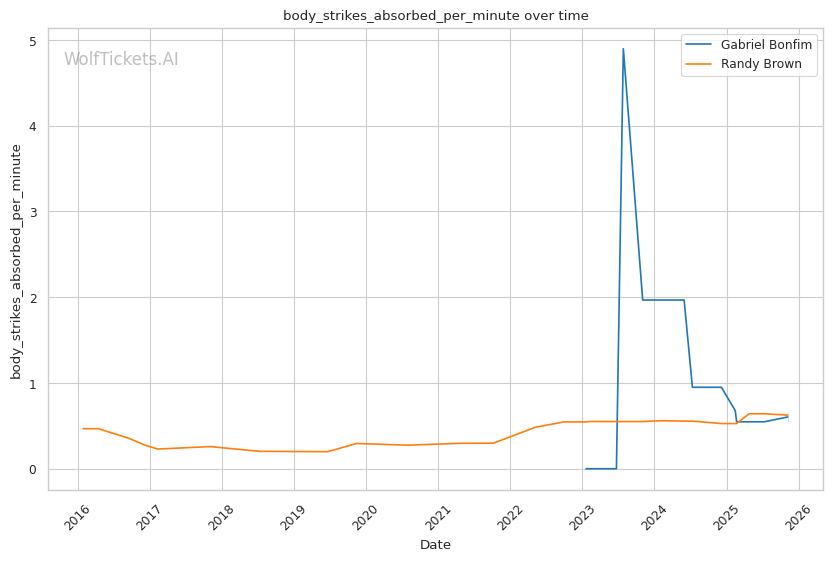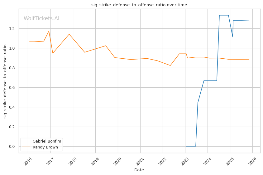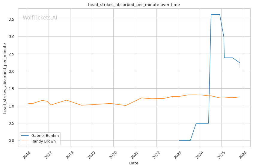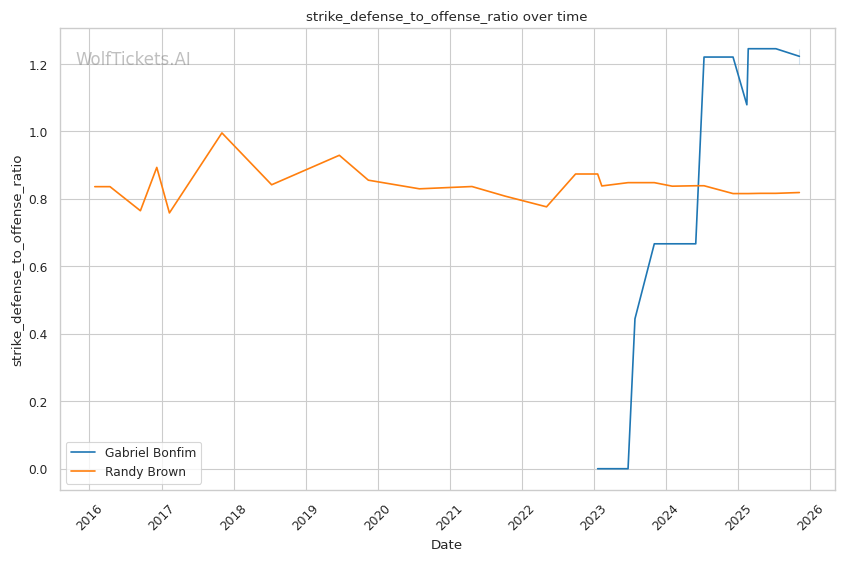Striking Defense Percentage (+4.0): Bonfim's 56.56% striking defense versus Brown's 43.68% creates a significant defensive gap. Bonfim absorbs 2.10 significant strikes per minute compared to Brown's 1.25 head strikes absorbed, but his overall defensive metrics favor him.