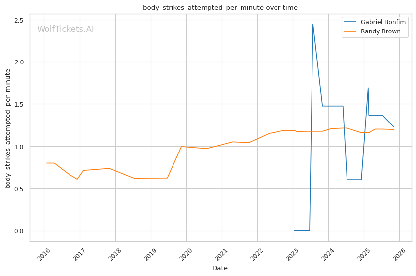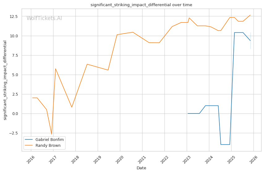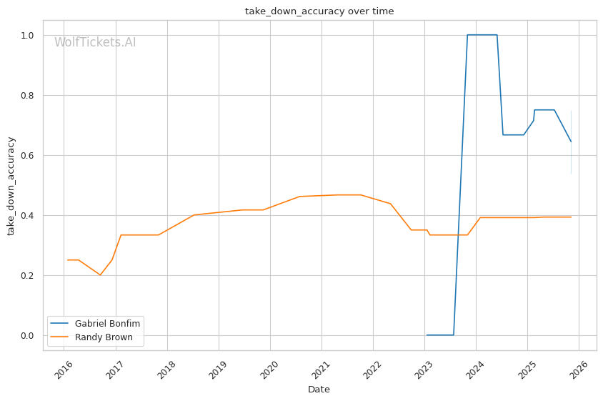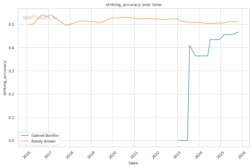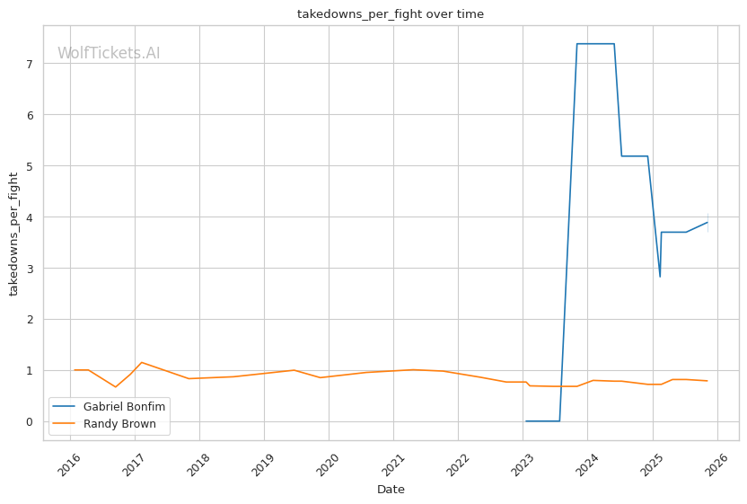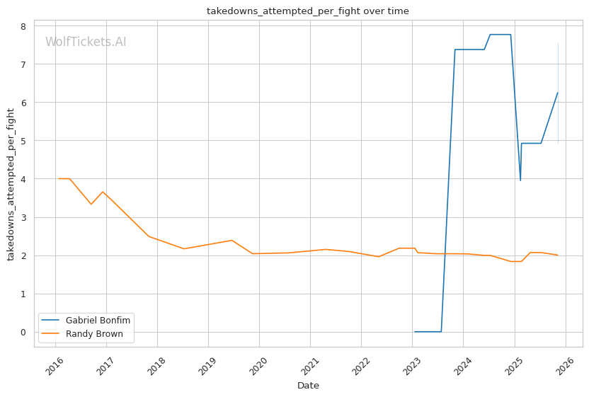 Recent Takedowns Attempted per Fight (+3.0): Bonfim's 6.39 recent takedown attempts per fight versus Brown's 2.17 shows Bonfim's commitment to wrestling exchanges. His 74.75% recent takedown accuracy versus Brown's 43.16% suggests he'll successfully implement his grappling game.