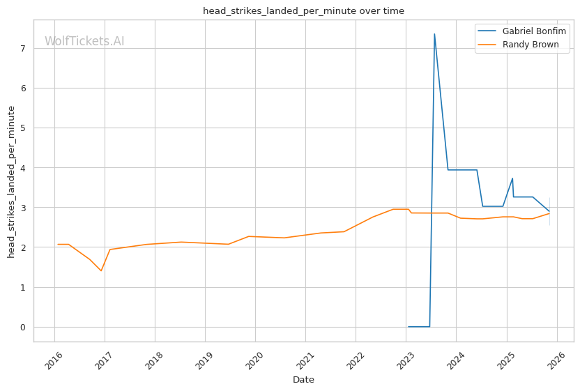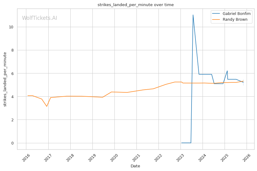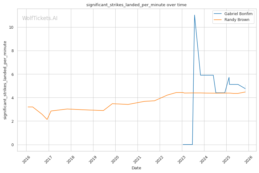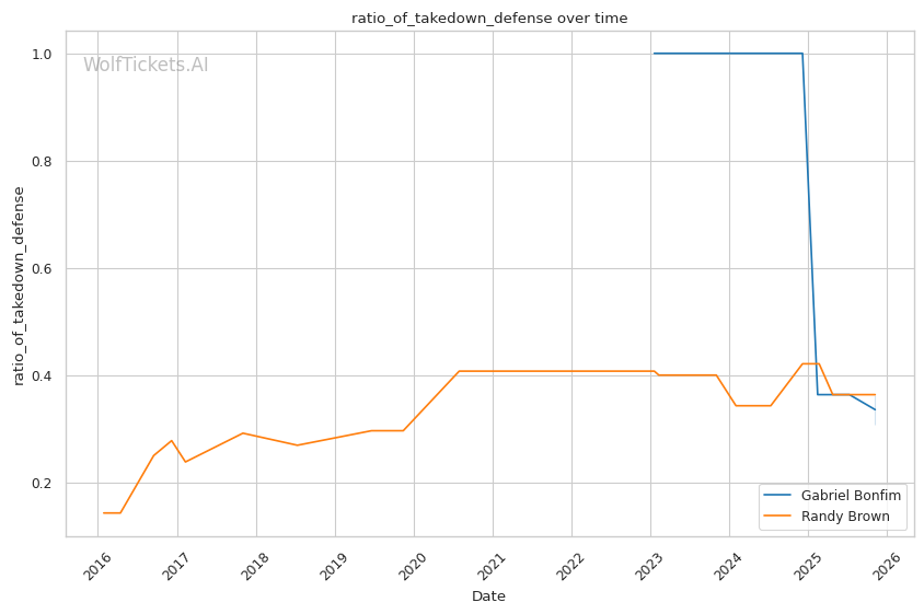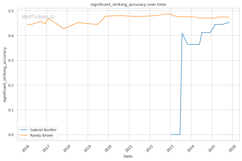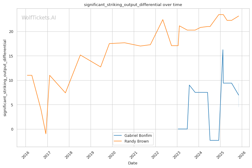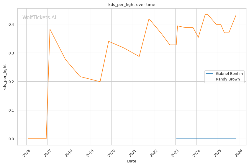 Recent Takedowns Attempted per Fight (+3.0): Bonfim's 6.39 recent takedown attempts per fight versus Brown's 2.17 shows Bonfim's commitment to wrestling exchanges. His 74.75% recent takedown accuracy versus Brown's 43.16% suggests he'll successfully implement his grappling game.
