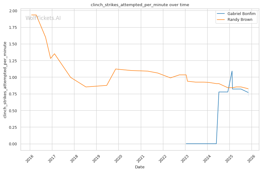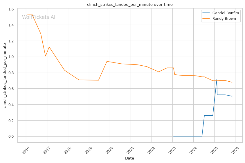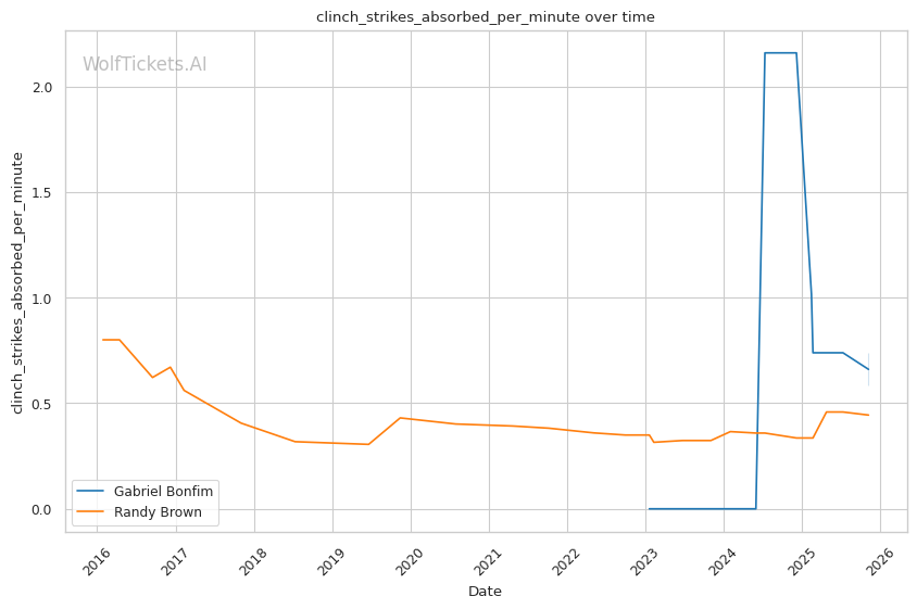 Brown's clinch striking has improved significantly. Against Bryan Battle, when Battle attempted "punch-and-clutch" tactics, Brown turned those exchanges into offensive opportunities with damaging knee strikes. His 0.68 clinch strikes landed per minute might seem modest, but he's using the clinch strategically rather than just defensively.