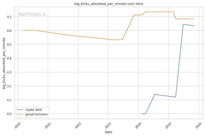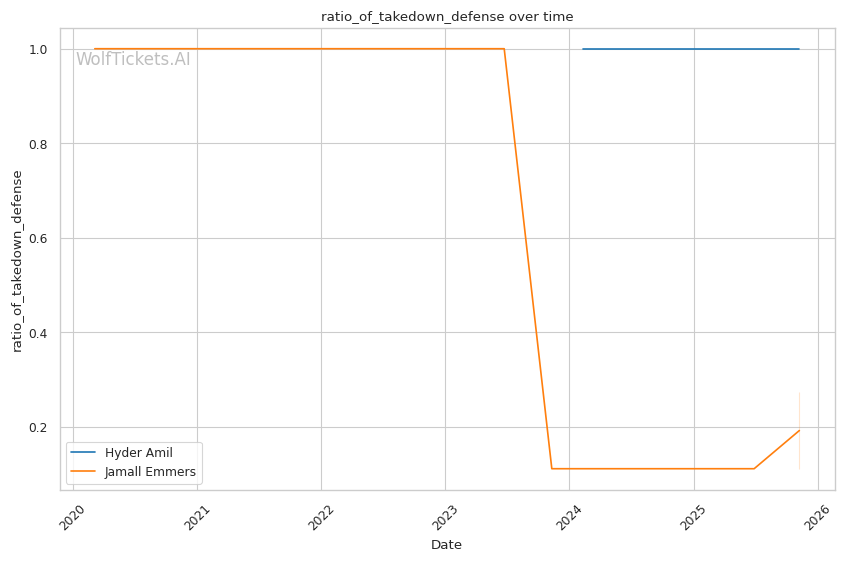 Amil's Sanchai kick catch specifically targets a technique Emmers employs regularly. Against Jenkins, Emmers consistently attacked the lead leg with low kicks to slow movement. If Amil catches these kicks and converts to wrestling positions as he did repeatedly against Gomis, Emmers' 27.27% takedown defense becomes catastrophically exploitable. Once on the ground, Emmers' scrambling ability and submission defense have proven insufficient against competent grapplers.