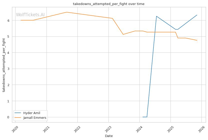 Recent Takedowns Attempted per Fight increased the score by 1.0—Amil's 6.44 recent attempts compared to Emmers' 5.42 shows greater wrestling threat, critical given Emmers' poor takedown defense