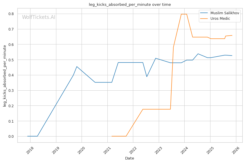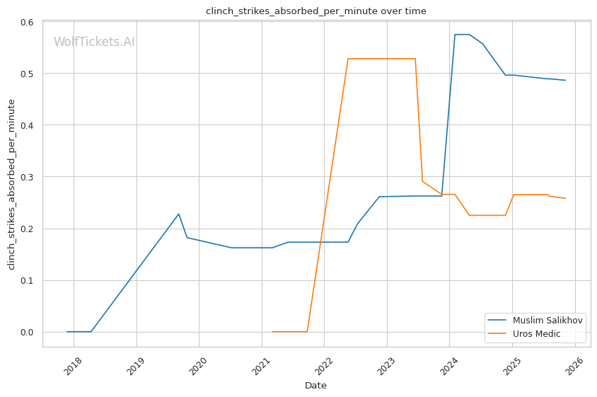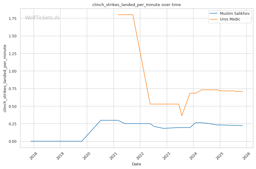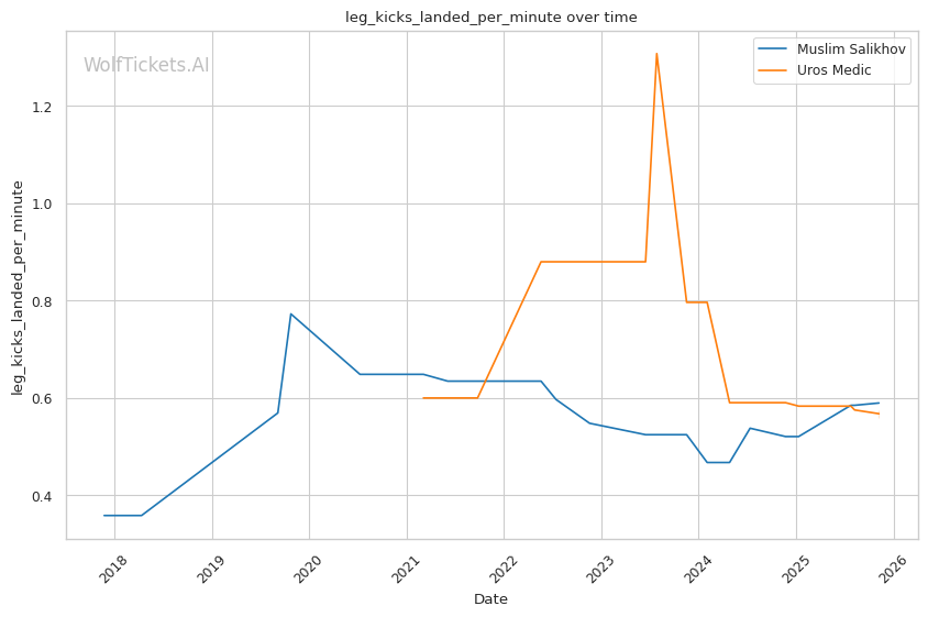 The leg kick battle favors Salikhov slightly. He lands 0.59 leg kicks per minute while absorbing 0.53, and his Sanda background gives him superior technique on both inside and outside low kicks. These could disrupt Medic's explosive movement and limit his ability to rush forward effectively. Against Li Jingliang, leg kicks proved highly effective at neutralizing Salikhov's rhythm—Medic could employ similar tactics, but his volume (0.56 leg kicks per minute) suggests he's less committed to this approach.
