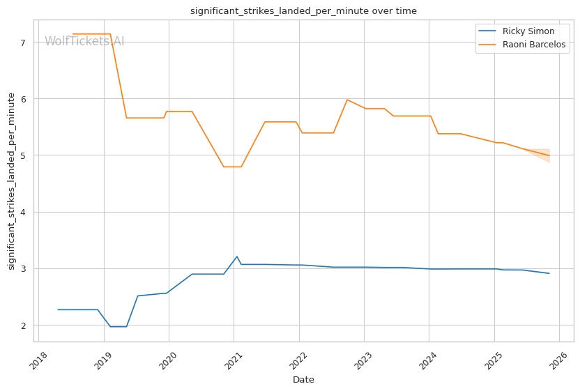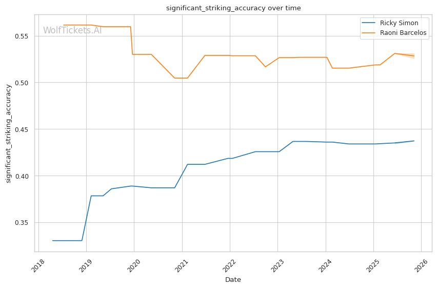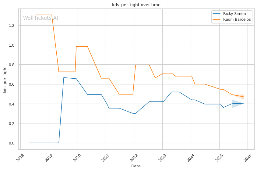 The pattern shows the model has been more reliable predicting Barcelos's performances, particularly his ability to defeat younger fighters through superior fight IQ and cardio. The model's tendency to overestimate Simon against quality opposition while underestimating Barcelos against prospects suggests the current prediction favoring Barcelos is well-founded.