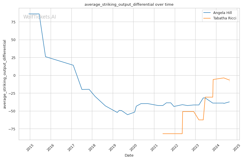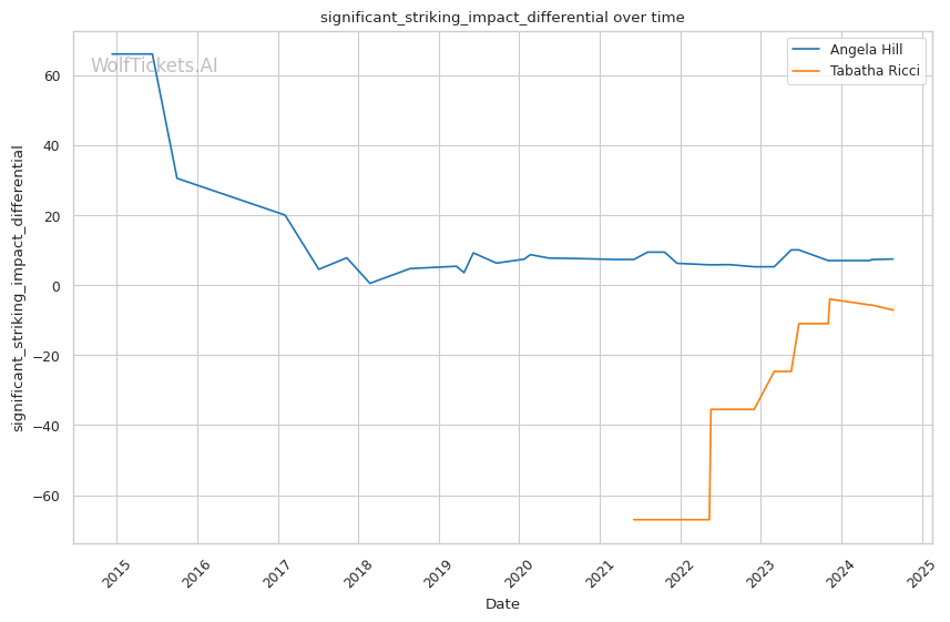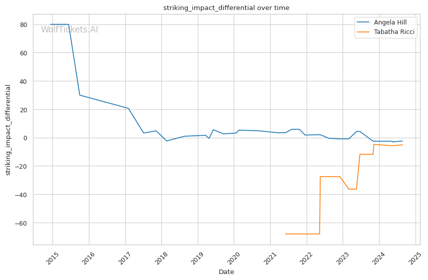 Significant Striking Impact Differential: Hill has a higher Significant Striking Impact Differential (7.4400) compared to Ricci (-8.5714), indicating that Hill tends to land more impactful strikes relative to her opponents. This could be a crucial advantage in a primarily striking-based matchup.