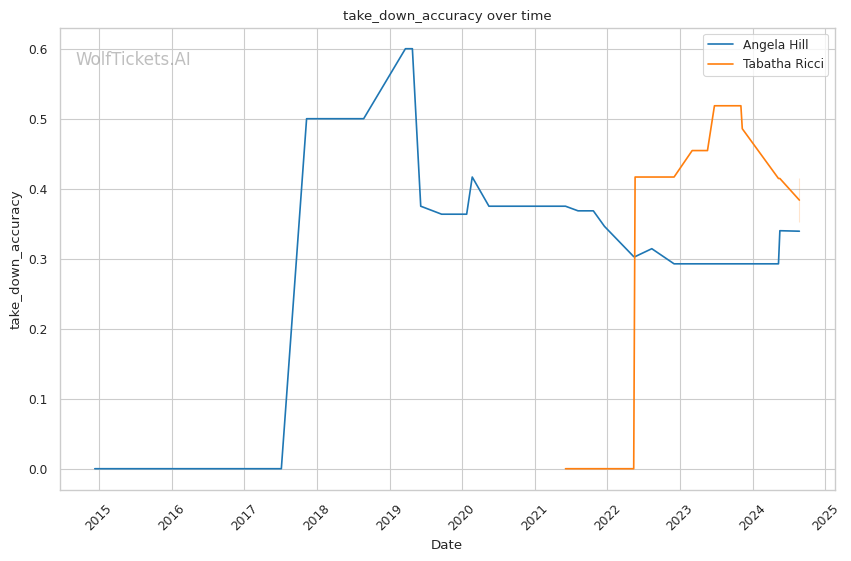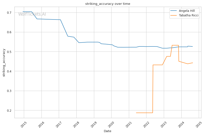 Striking Output and Accuracy: Hill has demonstrated a higher striking output (6.2586 Strikes Landed per Minute) and accuracy (52.56% Striking Accuracy) compared to Ricci (6.1950 Strikes Landed per Minute, 44.76% Striking Accuracy). These metrics suggest that Hill may be able to outland and more consistently connect with her strikes against Ricci.