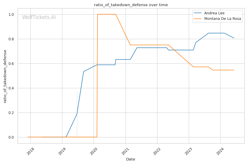 Andrea Lee is a well-rounded fighter with a strong striking game and solid takedown defense. In her last fight against Cynthia Calvillo, she showcased her powerful striking, landing a vicious head kick that led to a KO/TKO victory in the second round. Lee's striking defense percentage of 54.64% and significant striking defense percentage of 62.73% are both higher than De La Rosa's, indicating she is better at avoiding damage on the feet.