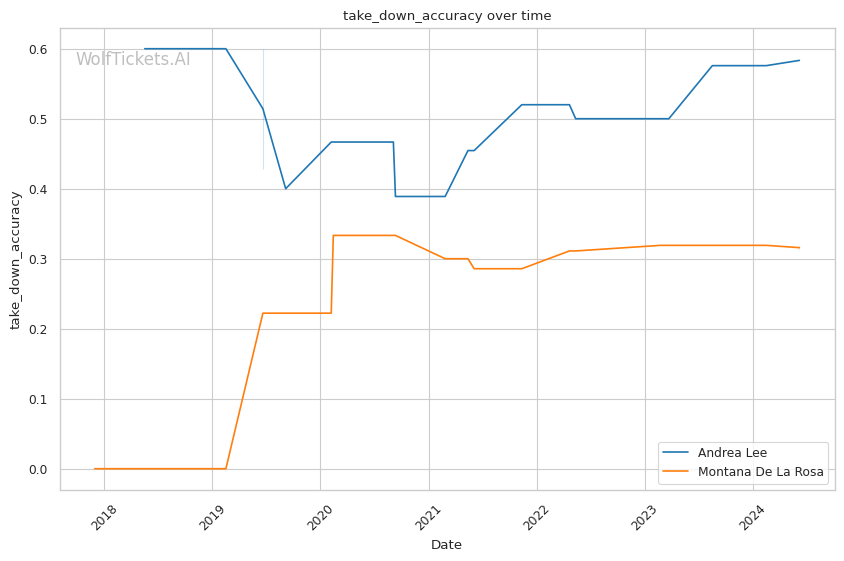On the feet, De La Rosa tends to absorb more strikes than she lands. Her striking defense percentage of 36.47% and significant striking defense percentage of 44.16% are both lower than Lee's. She does have a slight reach advantage at 68" compared to Lee's 69", but that likely won't be enough to overcome the striking discrepancy.