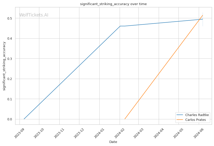 Despite incorrectly picking against Radtke vs Urbina, WolfTicketsAI now favors him against Prates. Radtke's strong takedown defense (100% in the UFC) and striking defense (47.7%) are assets. He lands 3.29 significant strikes per minute at 52.9% accuracy.