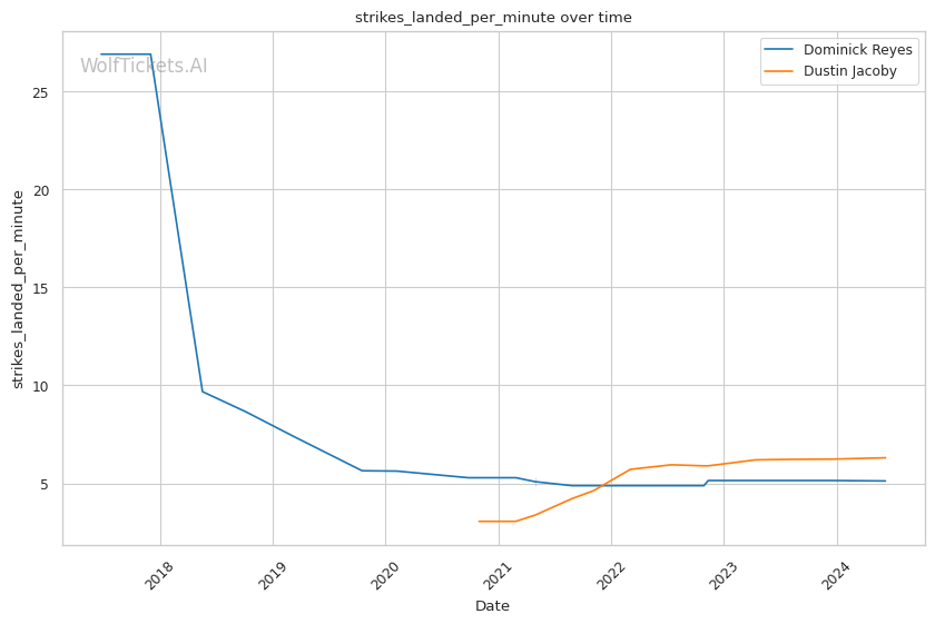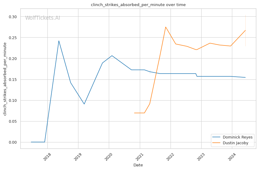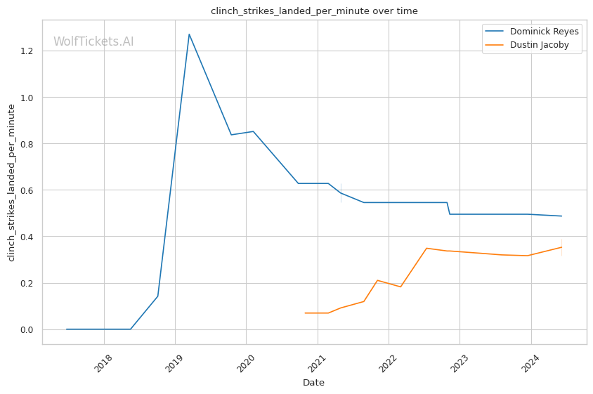 Dustin "The Hanyak" Jacoby is a seasoned kickboxer with crisp, technical striking. He lands 5.59 significant strikes per minute at 46% accuracy, outpacing Reyes. Jacoby's defense is also superior, evading 58% of opponents' significant strike attempts. In the clinch, Jacoby excels at avoiding damage, absorbing just 0.30 strikes per minute.