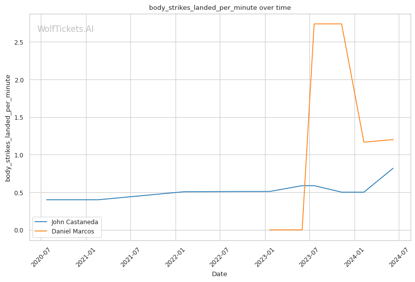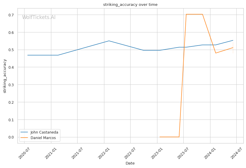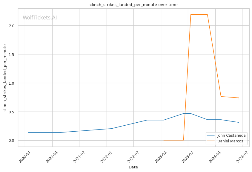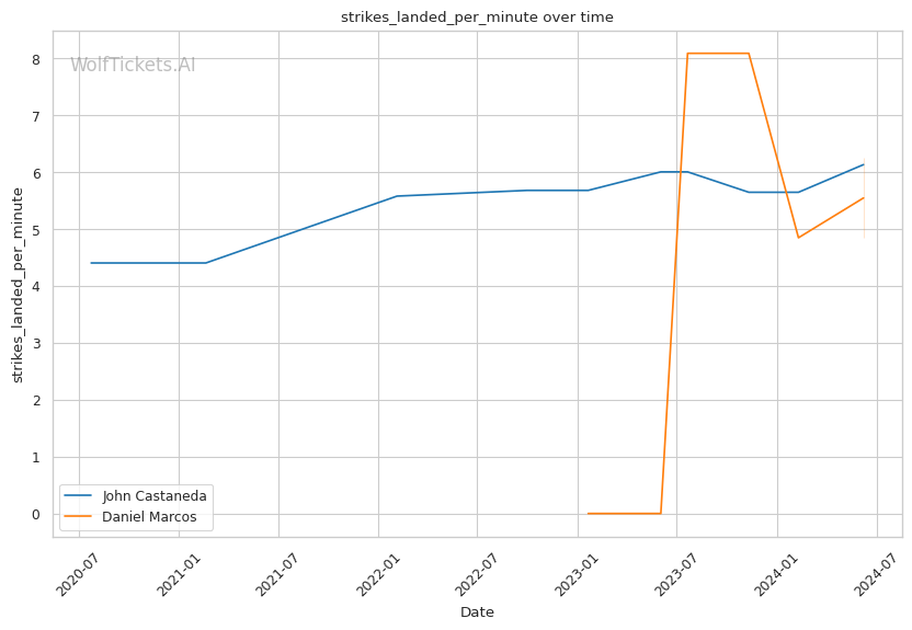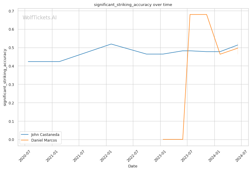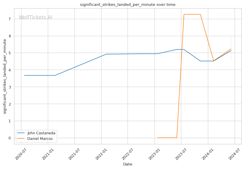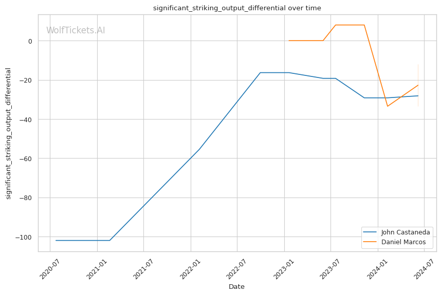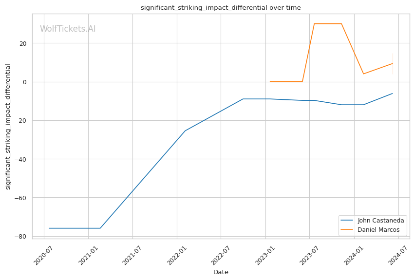Marcos' striking advantage: Marcos lands more significant strikes than Castaneda and absorbs far fewer, both in total and on a per-minute basis. Striking could be the key to victory for the undefeated prospect.