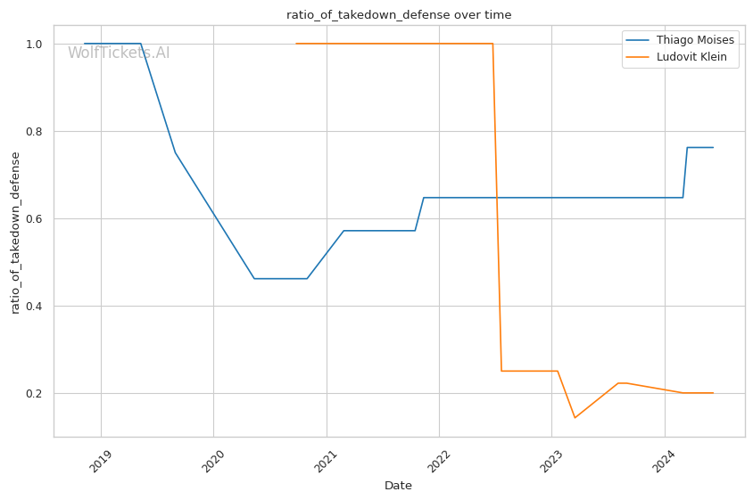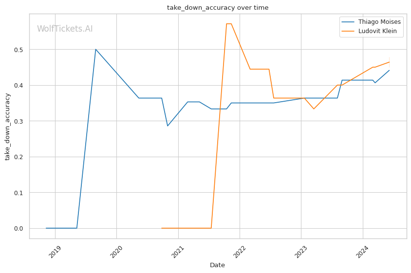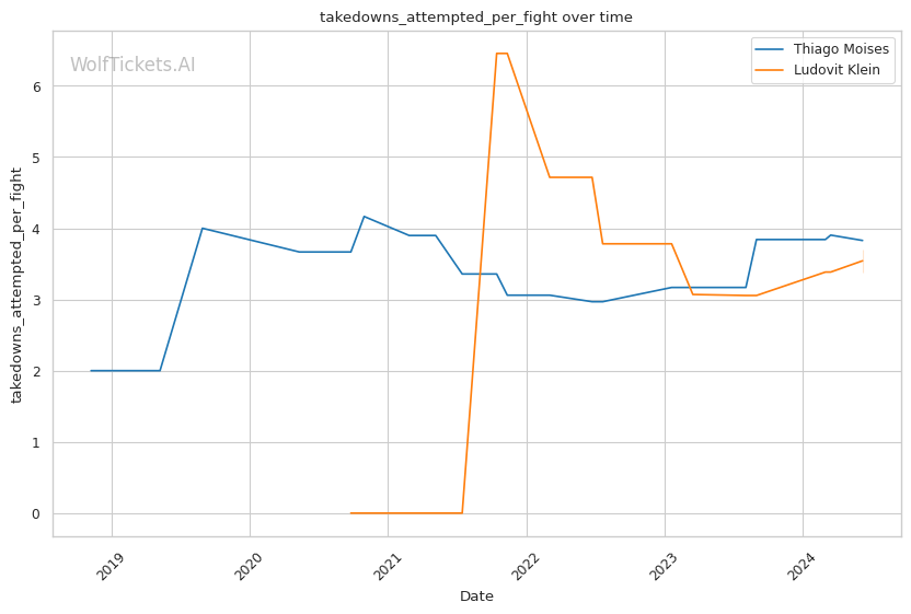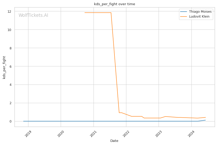 However, Moises has a clear path to victory by taking Klein down and attacking submissions. Klein's historically poor takedown defense means Moises will likely be able to drag him to the mat at some point. The question is whether Moises can capitalize with a submission or if Klein can survive and punish him on the feet.