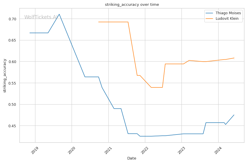 The model has struggled in predicting Klein's fights, going 0-4 in the last four bouts where it favored his opponent each time. This suggests that Klein has been underrated by the model historically. For Moises, the model has fared better, correctly predicting his last two fights and going 2-0.