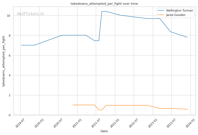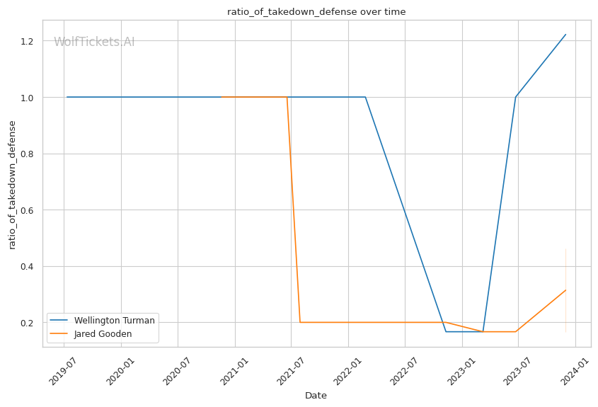 Considering the stats and recent performances, Wellington Turman's grappling and experience at a higher weight class could give him an edge over Jared Gooden's striking-centric approach. Turman's ability to execute takedowns against Gooden's weaker defense could be pivotal. WolfTicketsAI's prediction of Turman winning seems grounded in his grappling advantage and Gooden's defensive weaknesses.