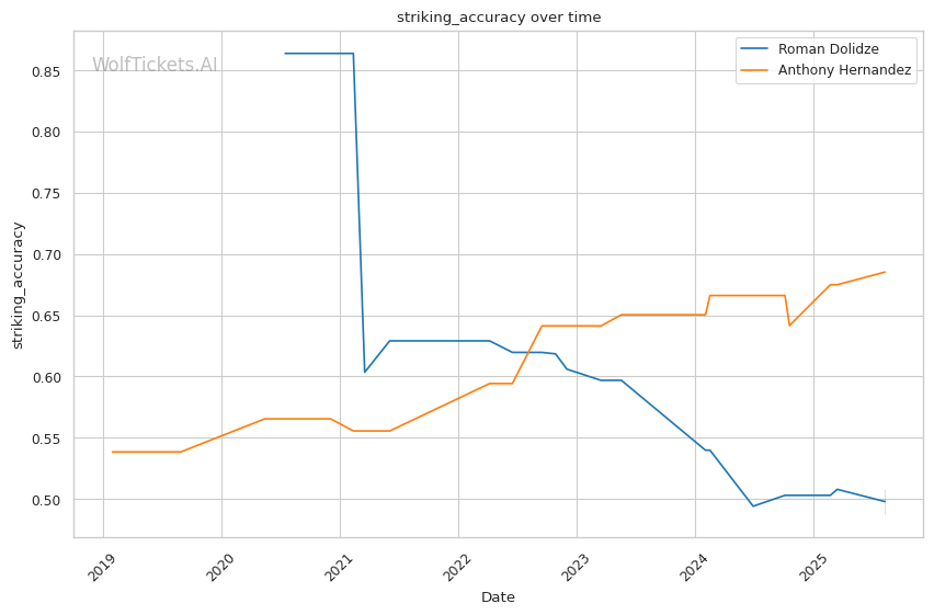 WolfTicketsAI has a mixed 4-4 record predicting Dolidze, with notable misses on his upset victories over Kevin Holland and Jack Hermansson where it favored his opponents. However, it correctly predicted his losses to Imavov and Vettori. For Hernandez, the model shows perfect 5-0 accuracy, correctly predicting all his recent victories including upset wins over Shahbazyan and Pereira. This perfect track record on Hernandez provides additional confidence in the prediction.