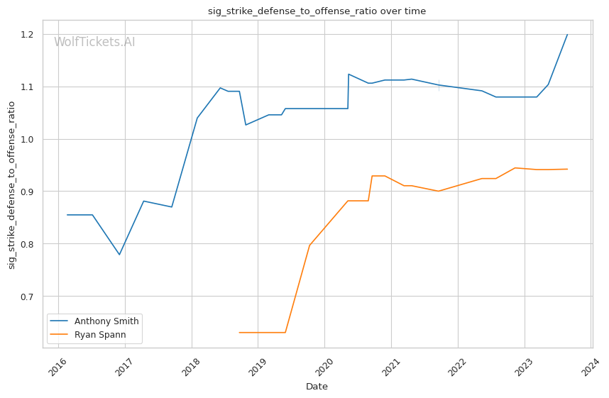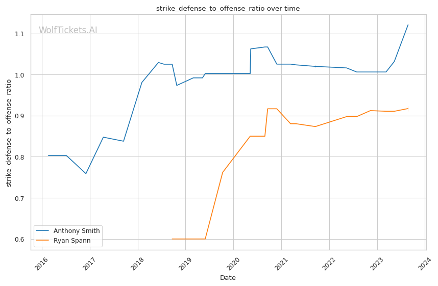 | Significant Striking Defense to Offense Ratio | 119.87% | 94.29% | 97.20% | |