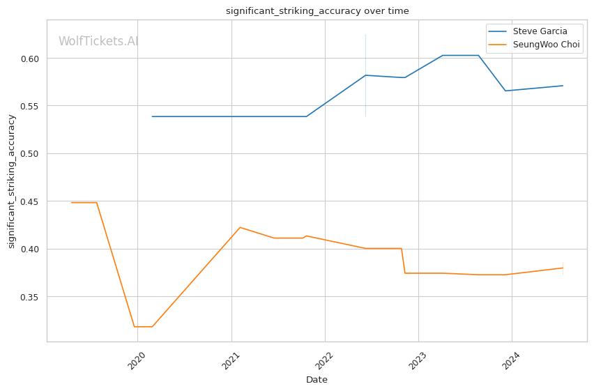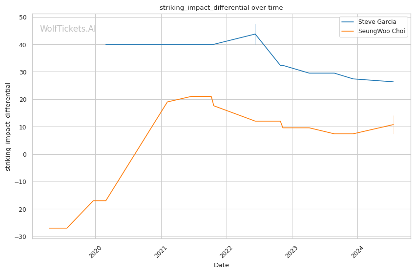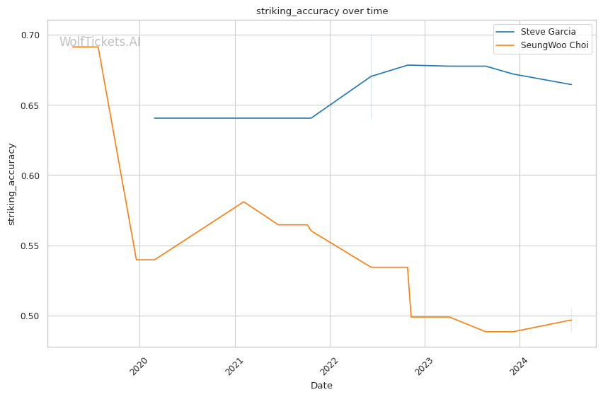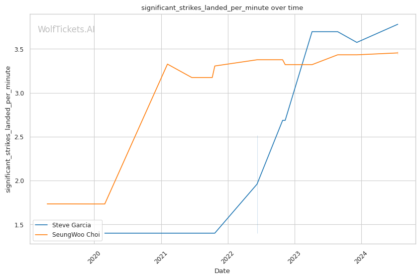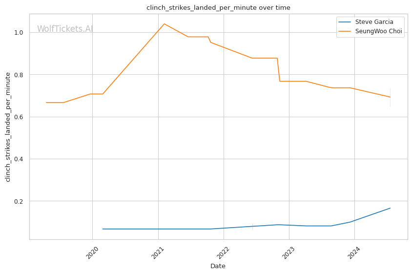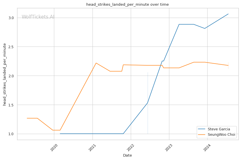 While Choi's striking output is lower than Garcia's, landing 3.48 significant strikes per minute, his accuracy and timing could be crucial. However, his striking defense percentage of 47.12% suggests vulnerability, which could be exploited by Garcia's high-pressure style.